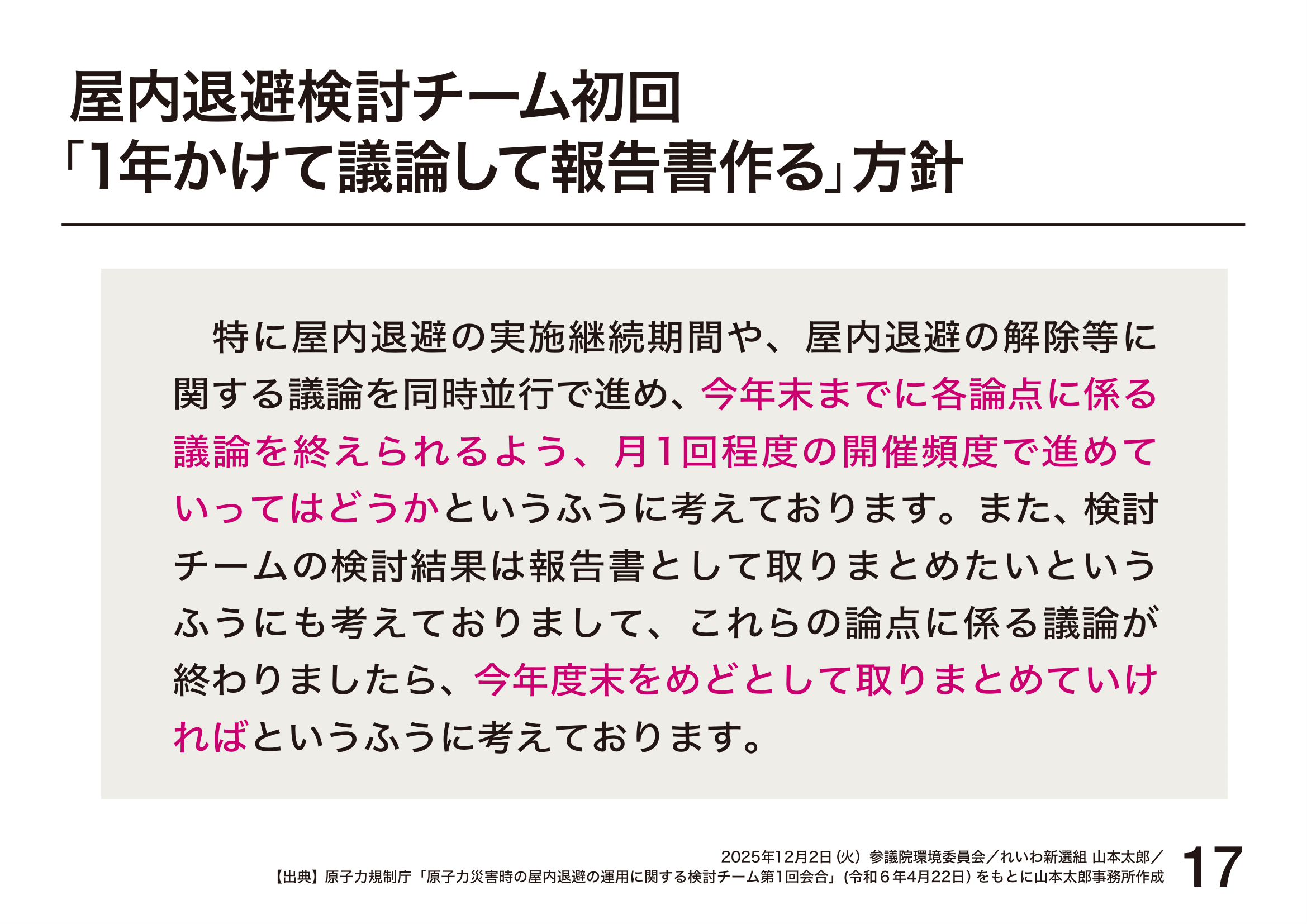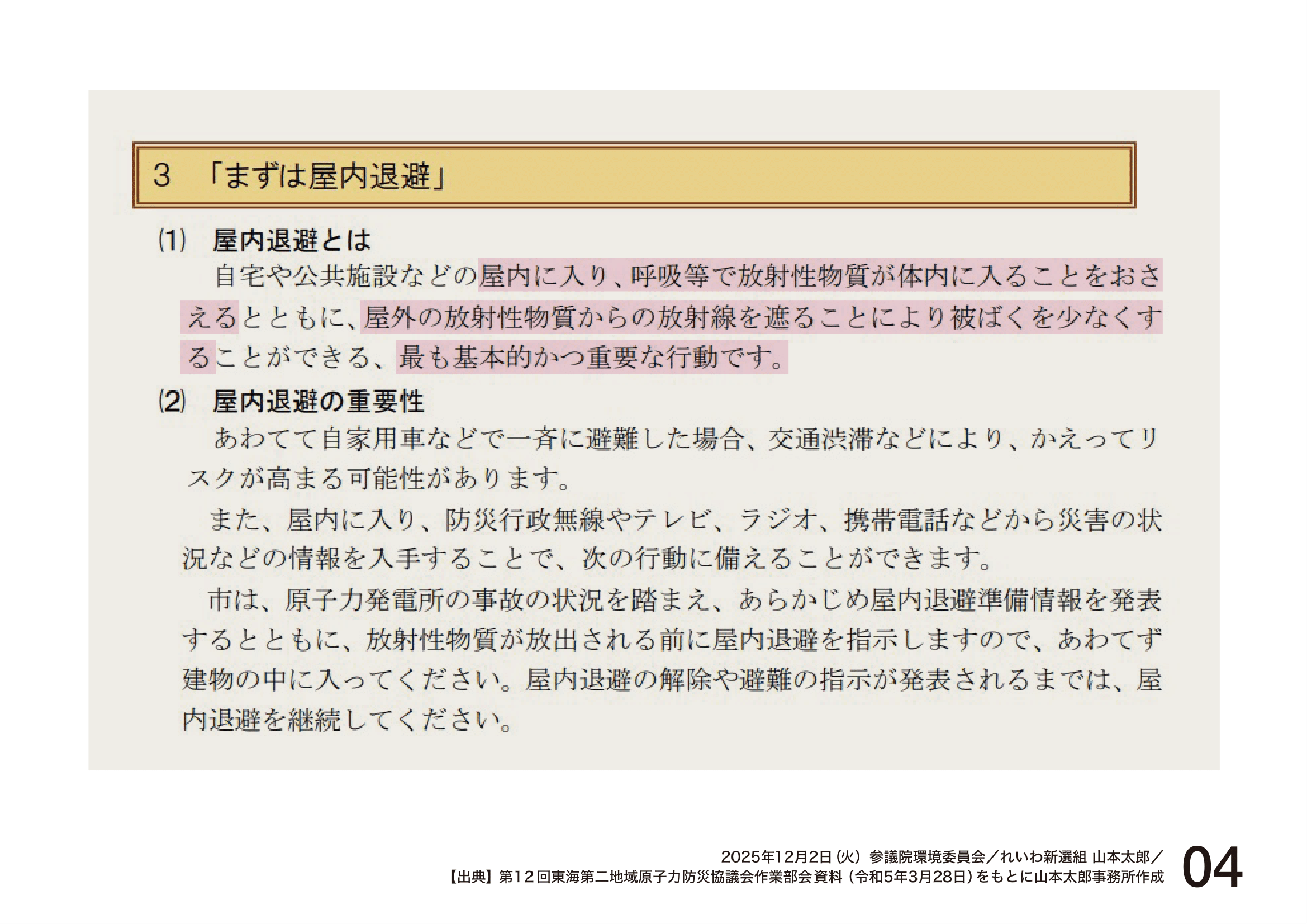 つまりは、この屋内退避の検討チームでの議論、報告書、指針の改定、全てが屋内退避計画の実効性を高めるどころか、現実を見ておりません。
