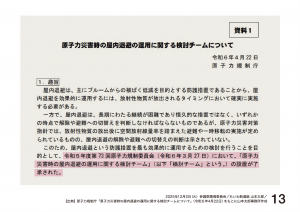 規制委員会は、昨年3月27日の公開会合で、公開の有識者会議、「原子力災害時の屋内退避の運用に関する検討チーム」の設置を決定しました。