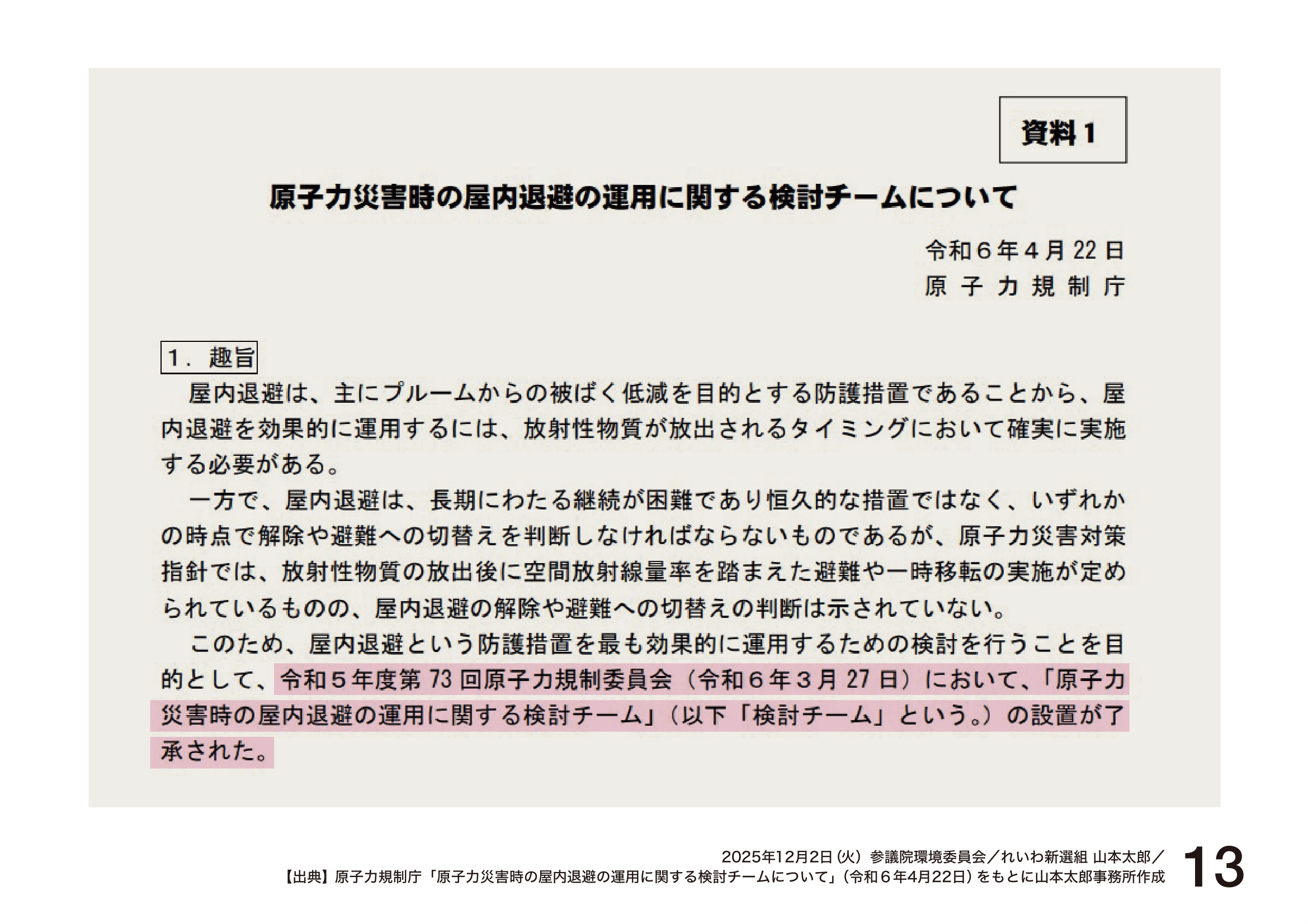 屋内退避の検討チームの設置の理由は、まさに能登半島地震であったような複合災害時の屋内退避の運用を検討する、改善するためということで結構だと思います。