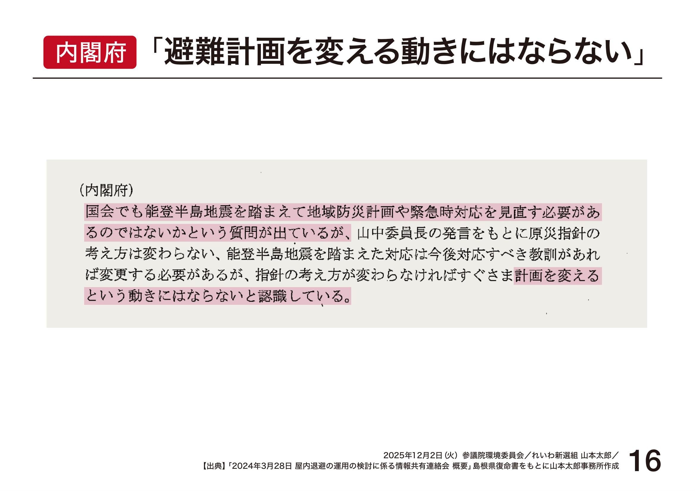 どうして大臣が、そして事務方が能登半島地震の教訓を受けた検討チームだ、そう言い切れなかったか、それには訳があるということです。