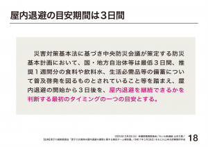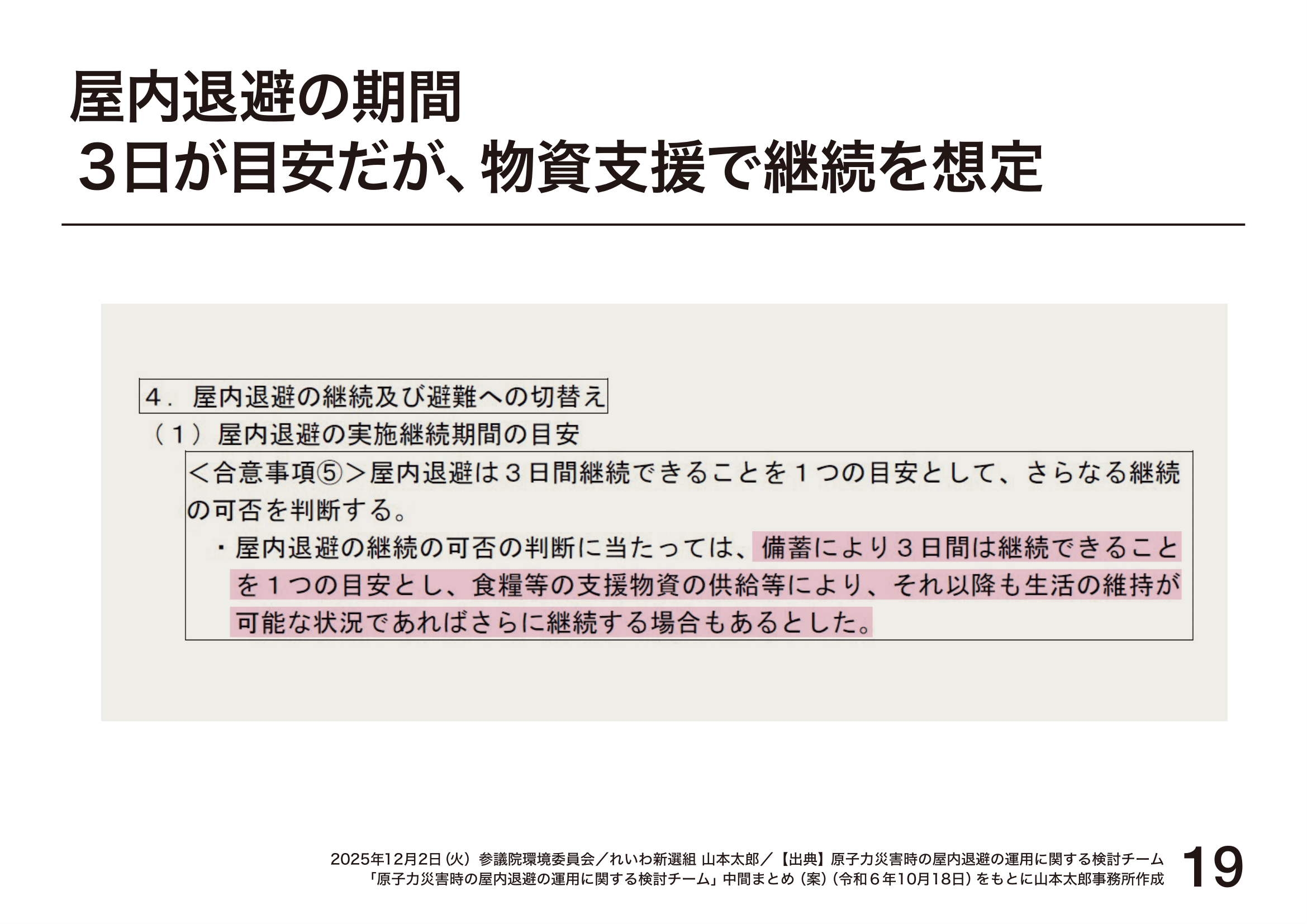 屋内退避の期間は物資や食料の支援を前提とし、継続を基本線に、一般家庭の食料、物資の備蓄状況を踏まえて3日間を目安としたと。