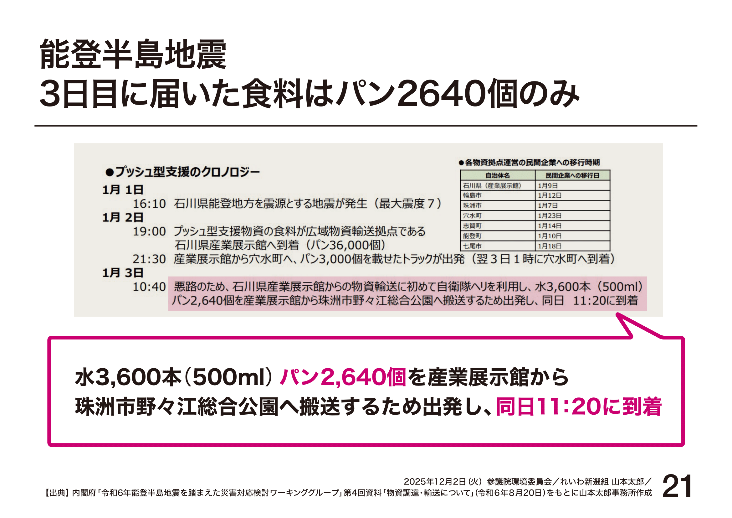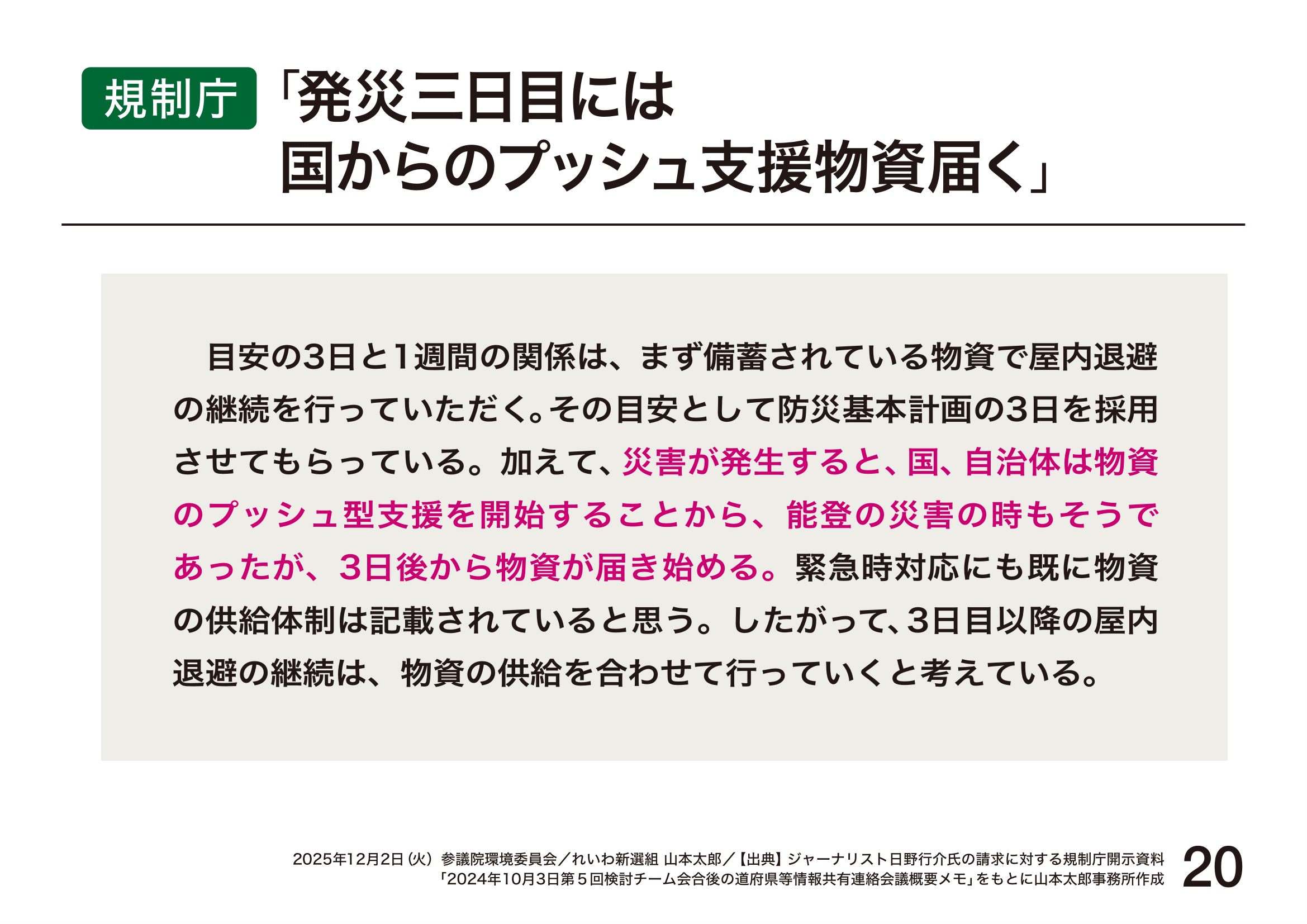 3日後から国の物資支援が届き始めるから大丈夫、能登のときもそうだったと。