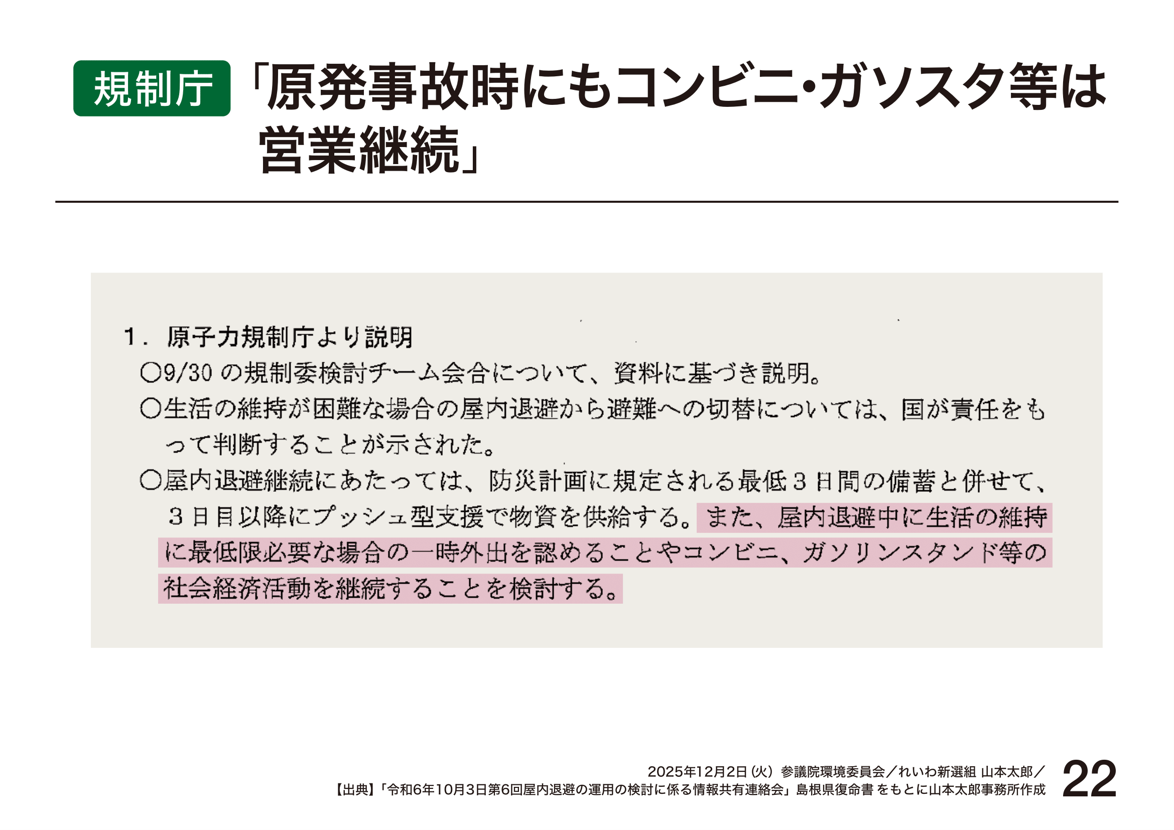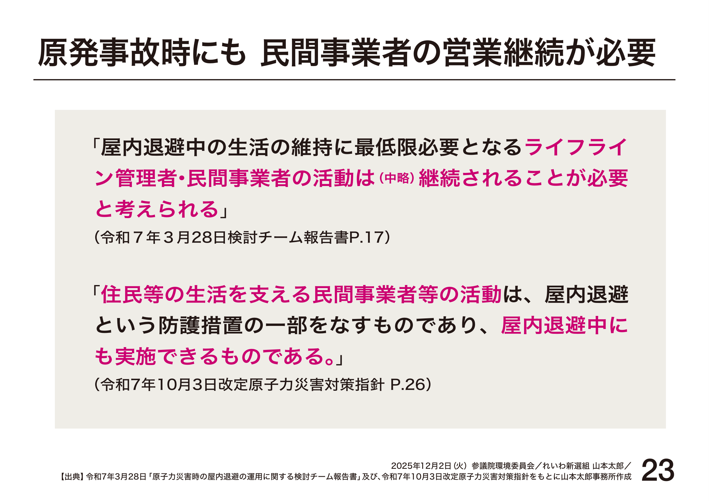 検討の結果、今年3月28日の報告書では、屋内退避中の生活の維持に最低限必要となるライフライン管理者、民間事業者の活動は(中略)これ、資料23見てくださいね、(中略)継続されることが必要と考えられると述べられている。