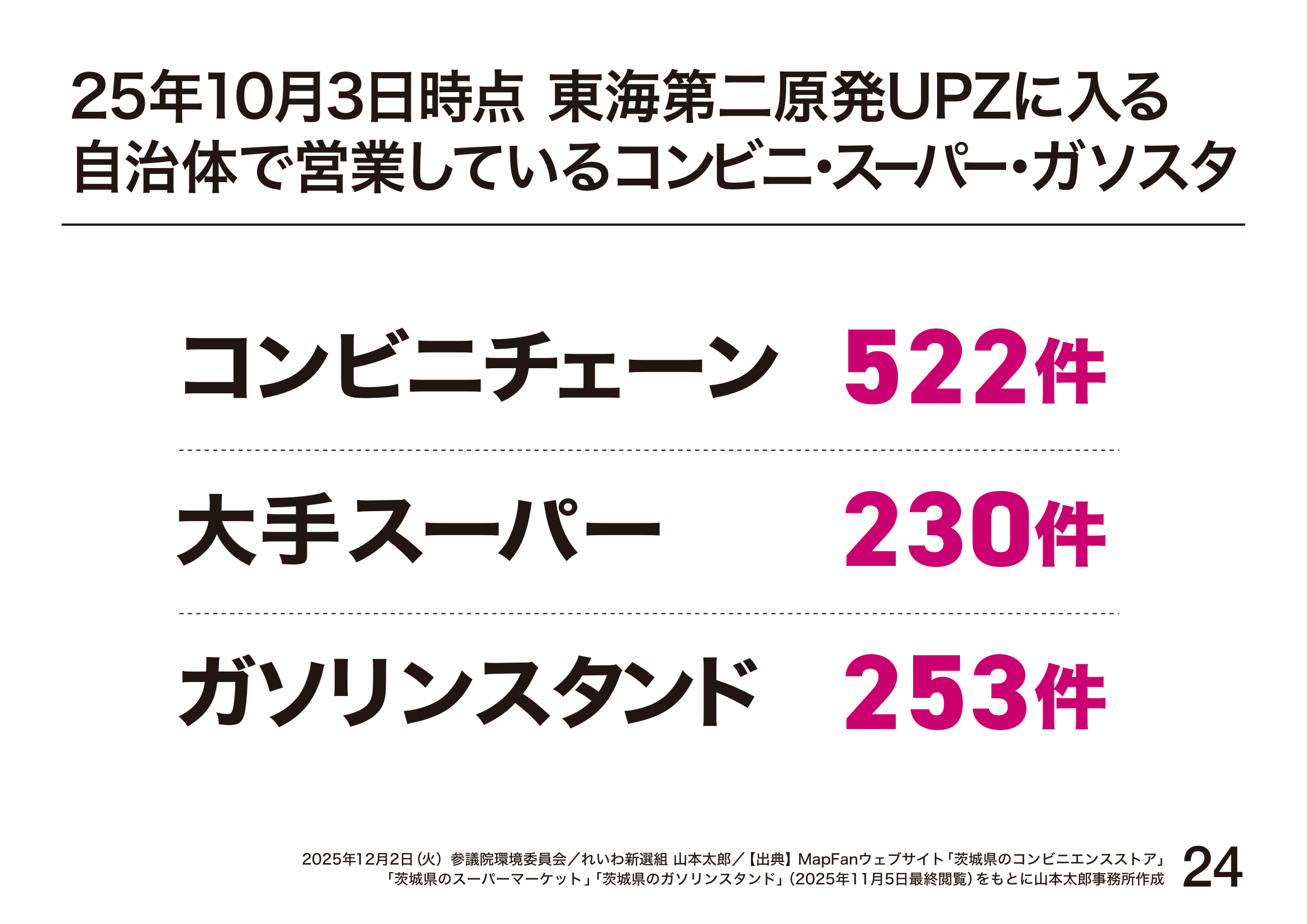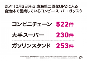 例えばもっと人口が多い東海第二原発、屋内退避を求められる地域で営業する主なスーパーいくつある、230店舗、ガソリンスタンドは253店舗。