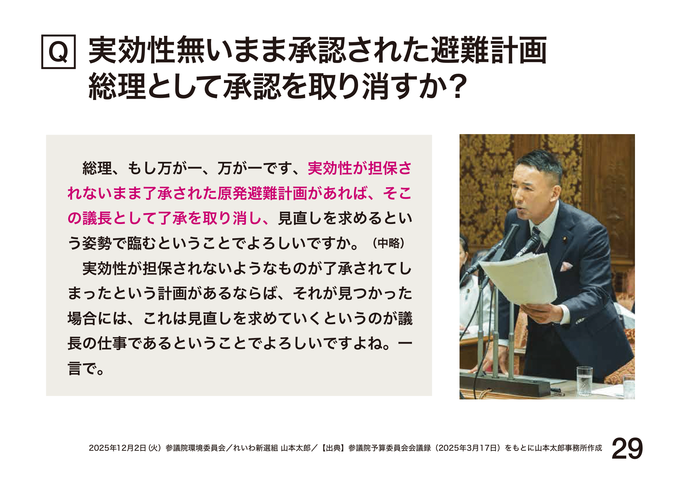 何も変わっていない。うそにうそを重ねただけですよ。このインチキに対して、あなた自身が新しい総理大臣に対して、これは避難計画の見直しが必要だ、もう1回これをやっていくんだという、やり直すんだということを言わなきゃ、命守るって言葉、うそになりますよ。