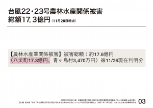 10月9日、13日、台風22、23号が八丈島を立て続けに襲い、建物、インフラの多くを破損。