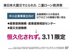 そもそも金融機関が機構による債権買取りに応じないなど問題もありましたが、救われた事業者がいたことは確かです。問題点を改善して、今回も使っていただきたい。