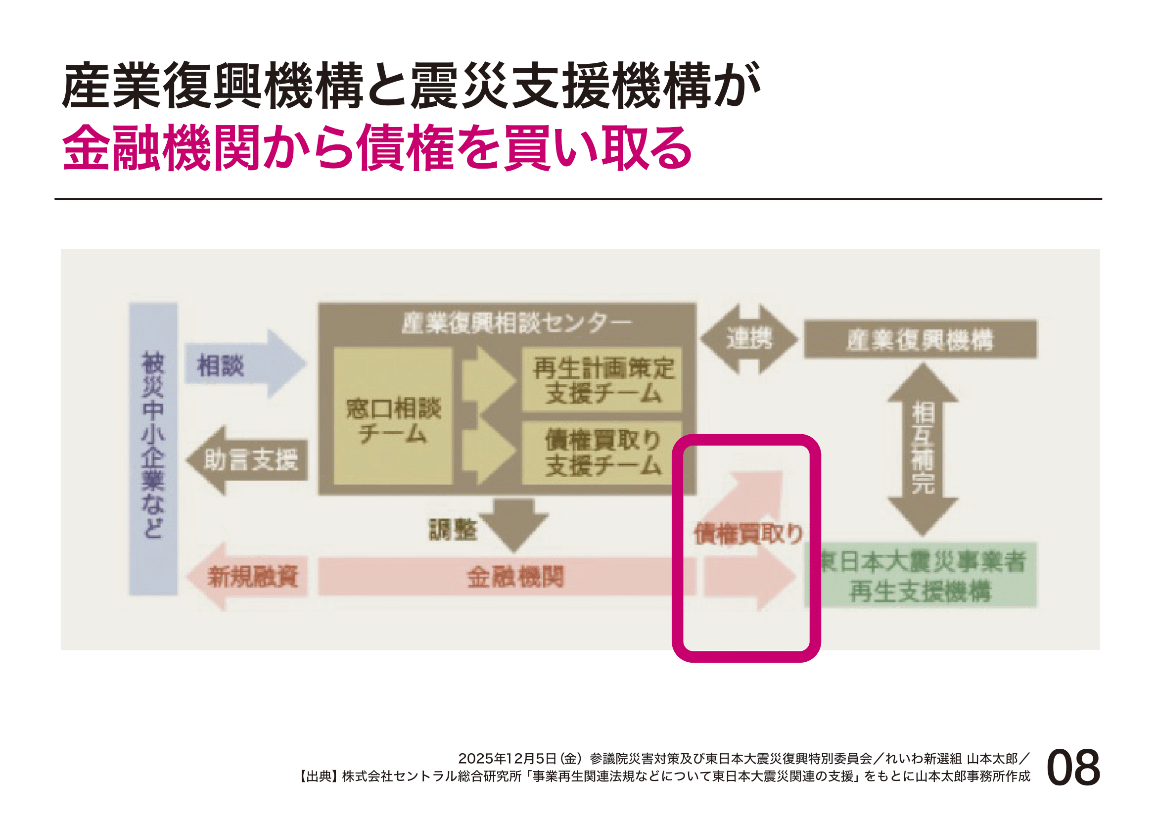 東日本大震災では、産業復興機構、震災支援機構を立ち上げ、金融機関から債権を買い取りました。