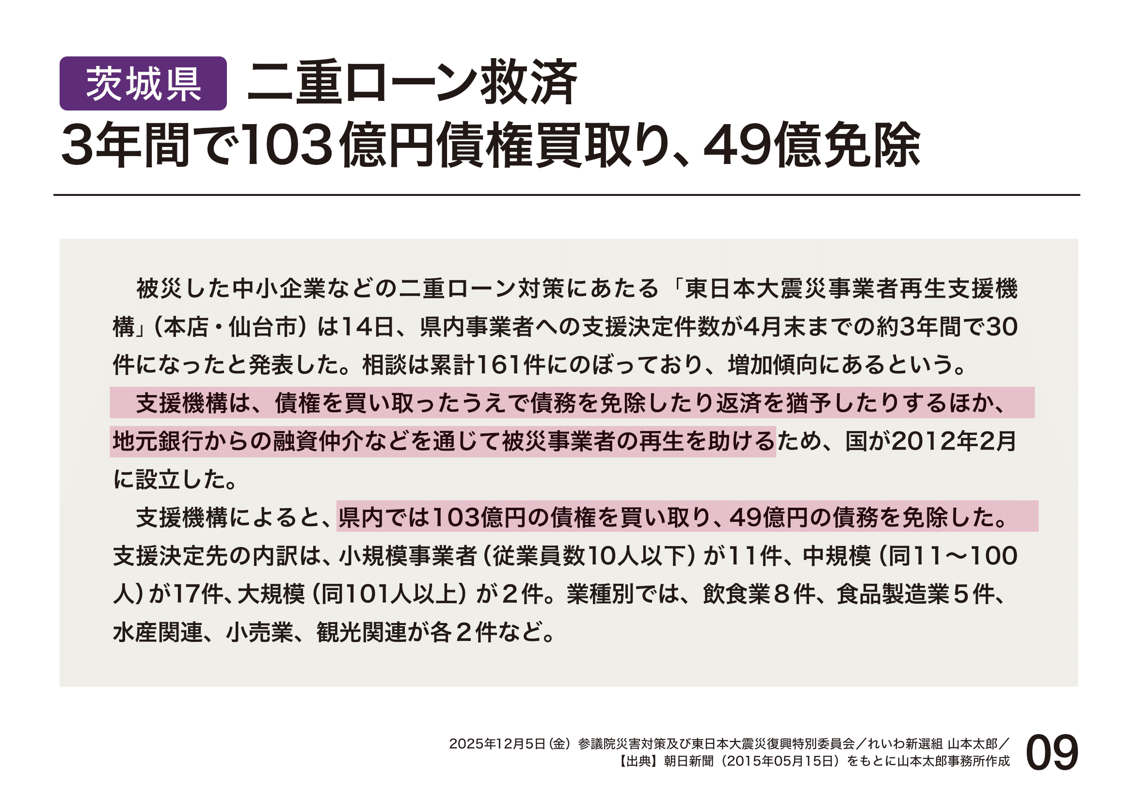 茨城県。3年間で震災支援機構が103億円の債権を買い取り、49億円を免除。