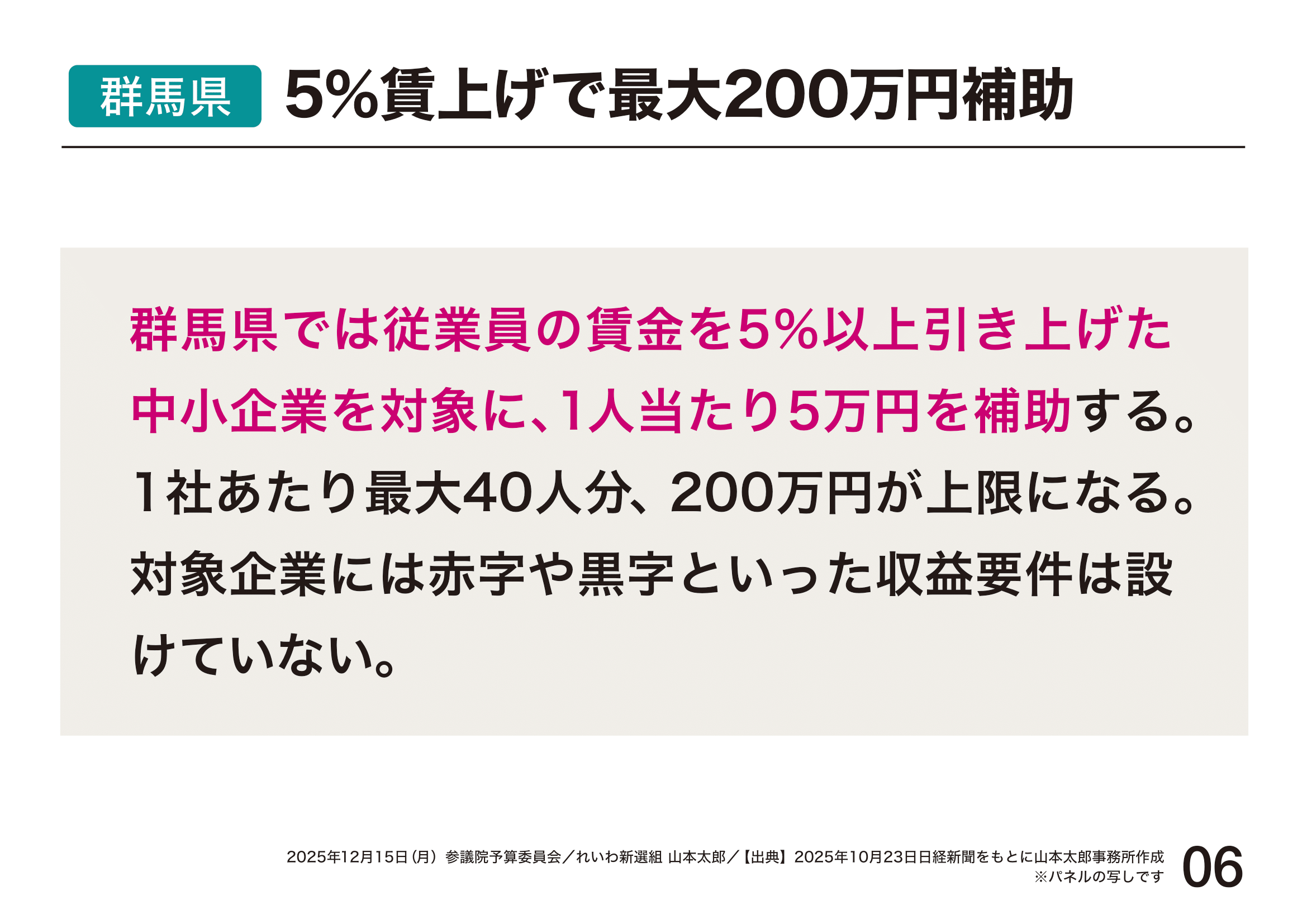 中小企業・小規模事業者の中には、賃上げ税制を活用できない、つまり赤字の状況の事業者がいる。その方々に何とか手当てをしたいということで、赤字の企業でその税制が活用できないところに地方から、地方公共団体から補助金を出していただく、そのようなメニューを用意いたしました。