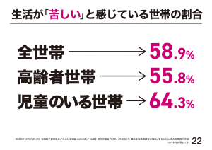 2024年国民生活基礎調査では、暮らしの状況を総合的に見てどう感じているかという生活意識を調査しており、生活が「苦しい」と答えた割合は、全世帯で56. 9%、高齢者世帯で55.8%、児童のいる世帯で64.3%になってございます。