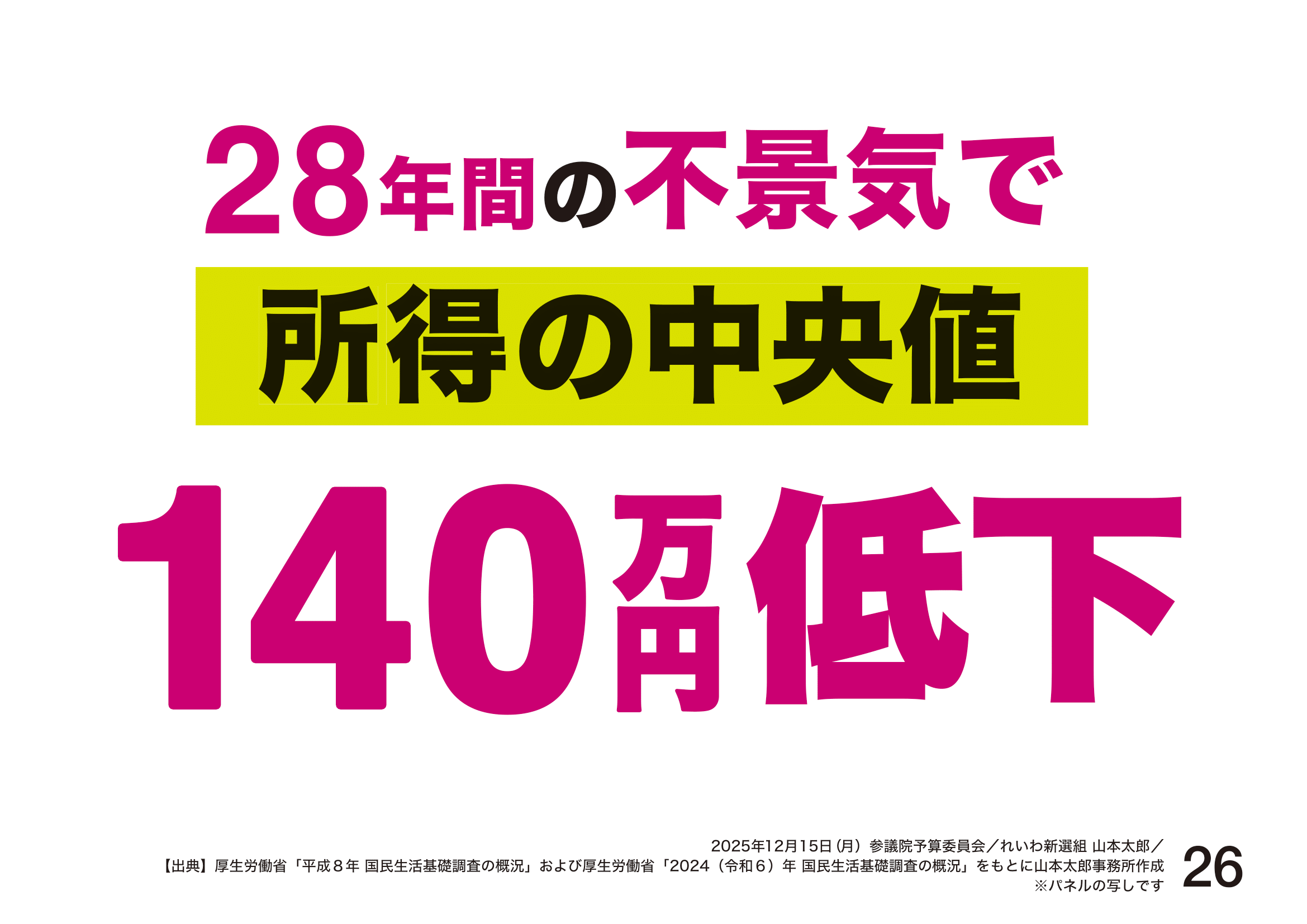 国民生活基礎調査において把握している所得の中央値でございますが、1996年の調査結果によりますと、1995年は550万円、2024年の調査結果によれば、2023年は410万円となってございます。