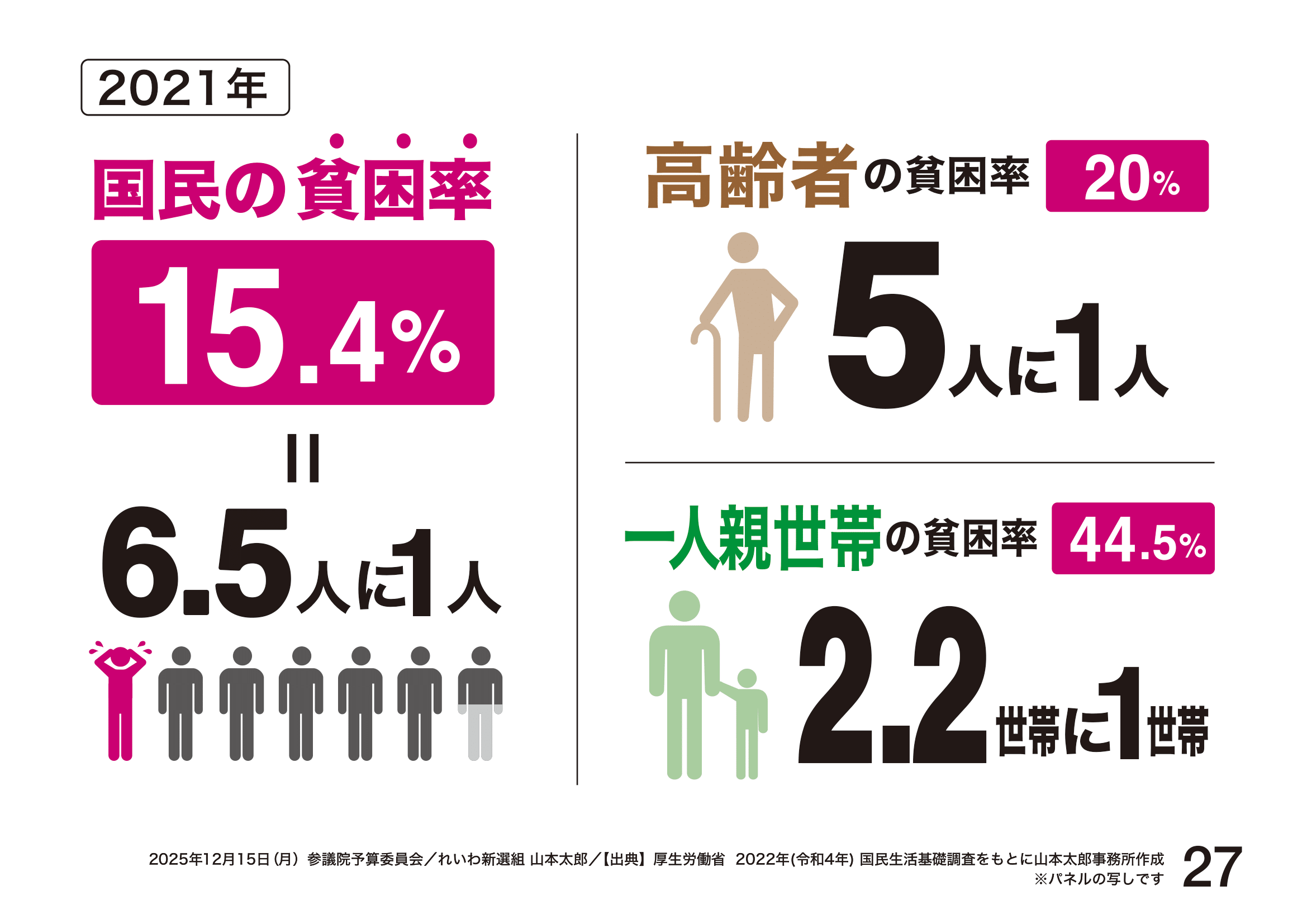 2022年国民生活基礎調査によれば、令和3年の相対的貧困率でございますが、全体が15.4%、65歳以上の高齢者の貧困率は20.0%、一人親世帯の貧困率は44.5%となってございます。