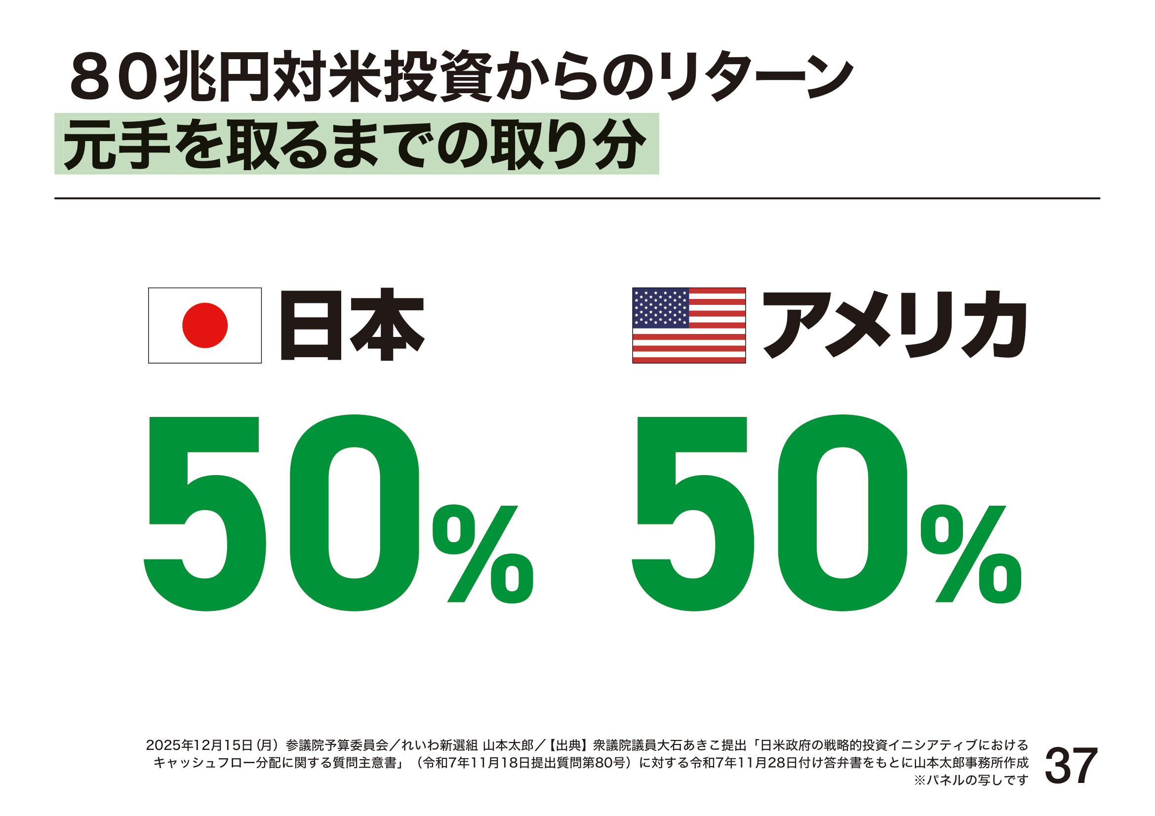 経産省、対米投資80兆円で出資した日本側のリターンについて、覚書のみなし配分額と日米が1対9とされる部分、説明を。
