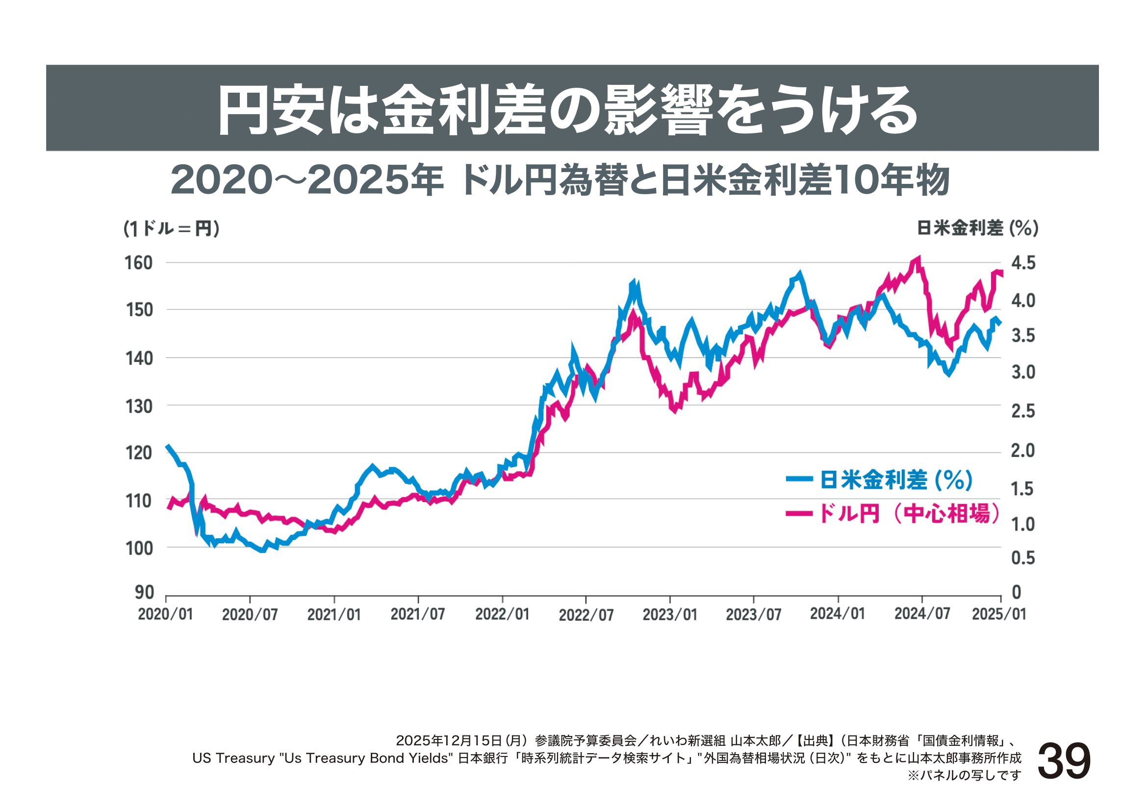 円が売られるかどうかの予想や日米の金利差、つまりは日米の景気の差が為替に影響するという話なんですよね。簡単に言うと、投資家などからすれば、円とドルならドルを持った方がもうかるから、円は売られてドルが買われて、これ円安になると。