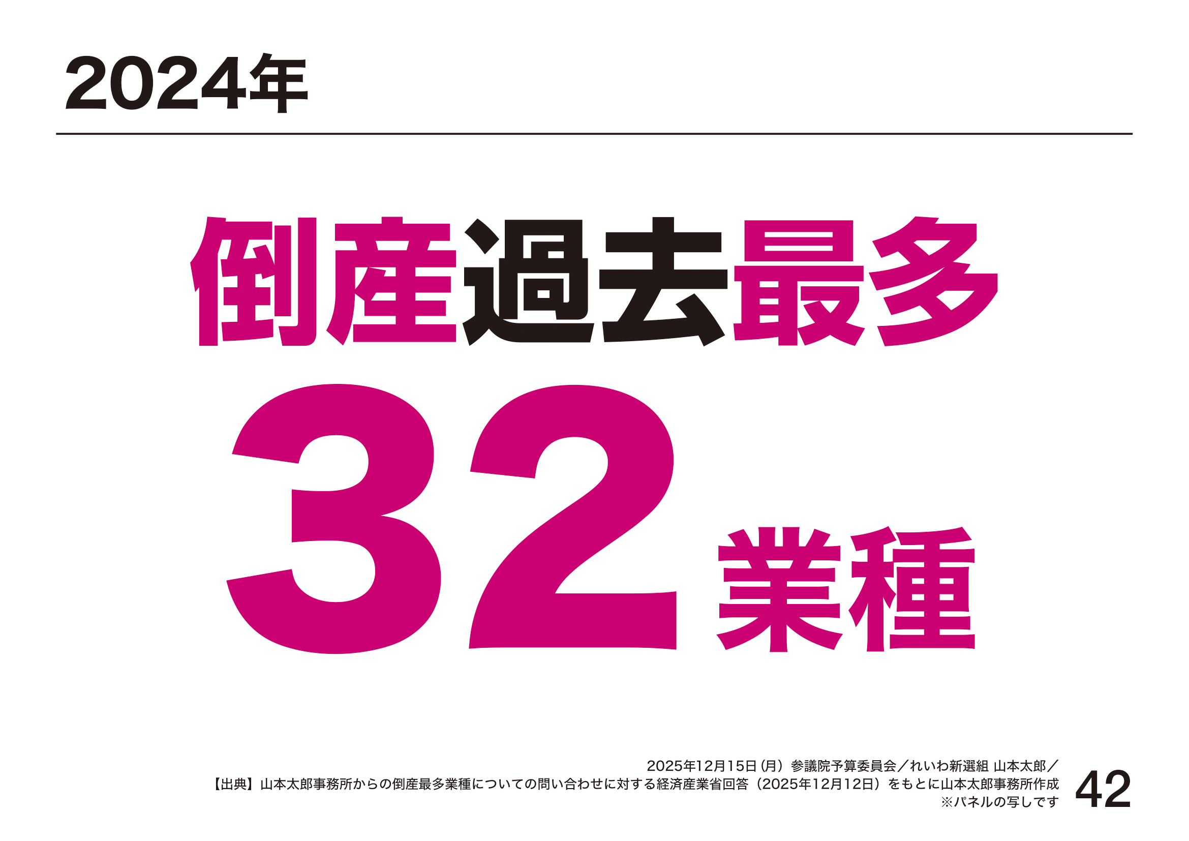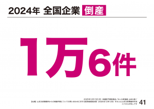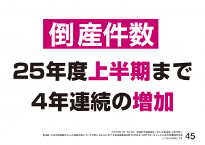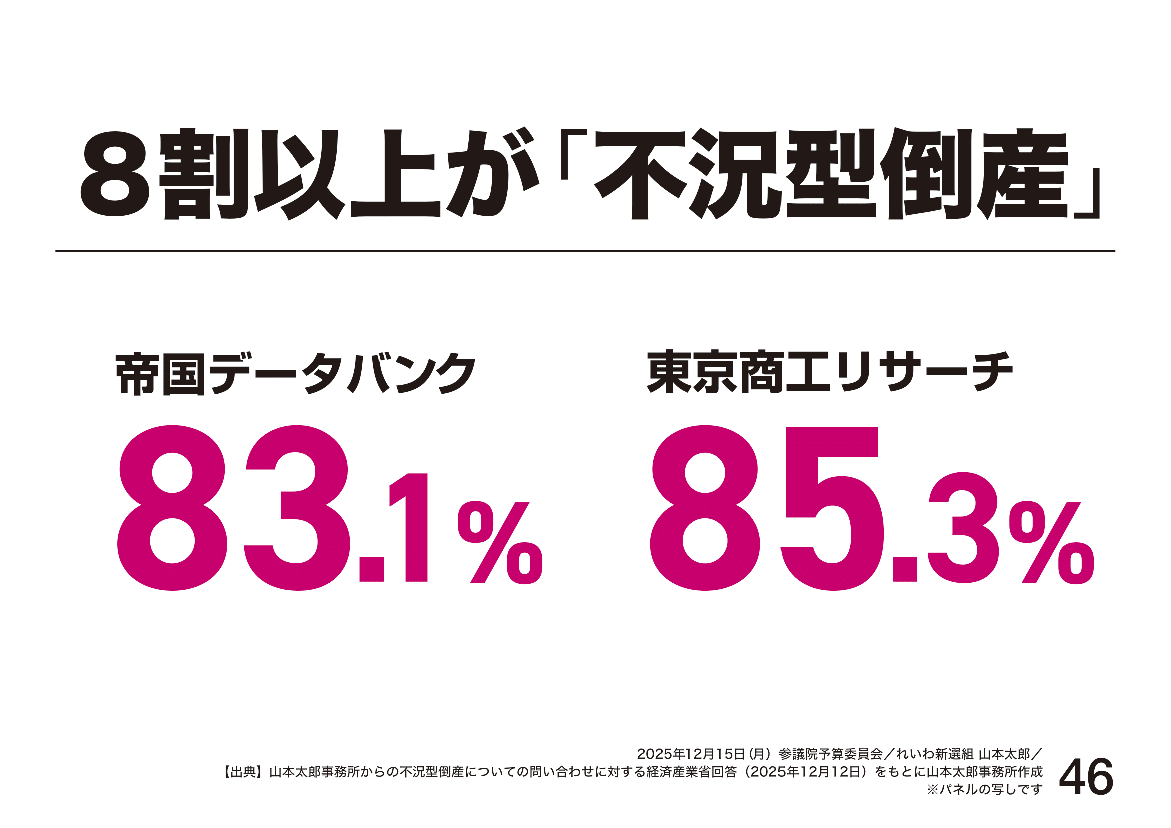 2025年度上半期におきまして、帝国データバンク、東京商工リサーチがそれぞれ定義をします不況型倒産は、倒産件数全体に占める割合につきましては、帝国データバンクで83.1%、東京商工リサーチで85.3%と指摘をされております。