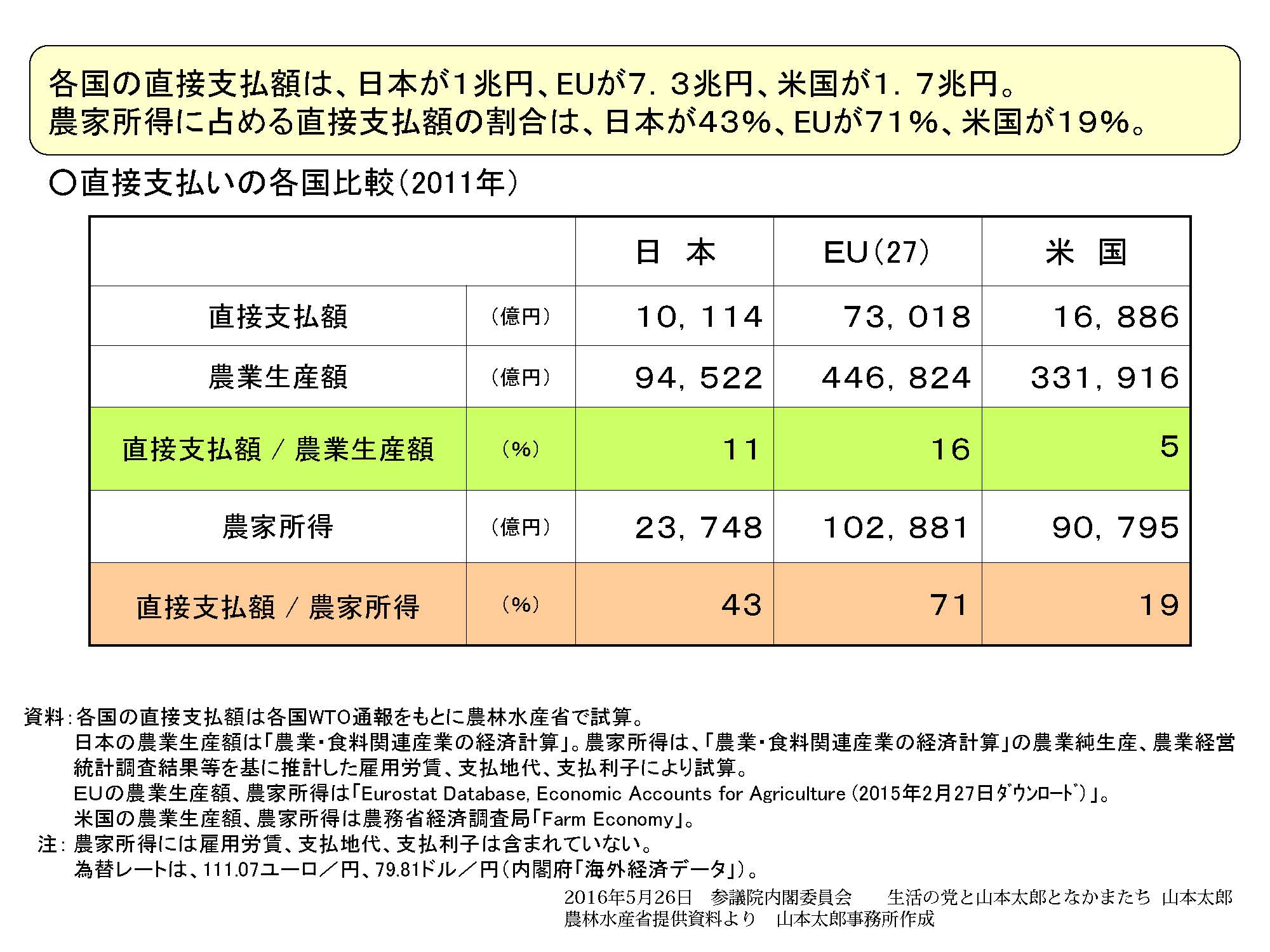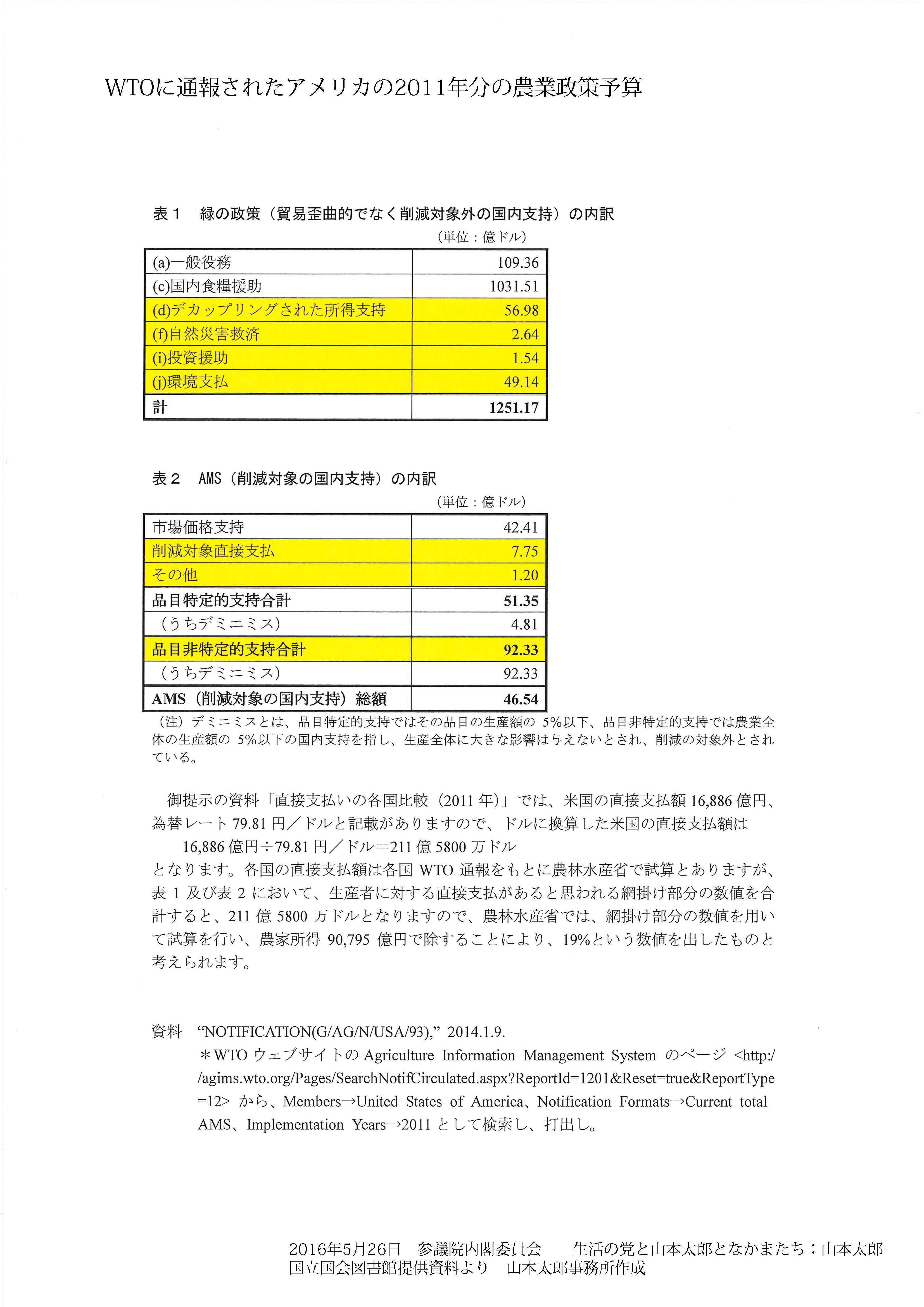 お手元の配付資料、御覧いただけますか。一枚目は農水省の資料でございます。各国の農家所得に占める直接支払額の割合、日本が43%、EUが71%、アメリカは19%となっています。そして、二枚目の資料、国立国会図書館に作成してもらったものです。農水省と同じ2011年の各国のWTOへの通報を基にした資料でございます。アメリカの農家への支出について、農水省の資料が見ているのはWTOに通報したものの中で黄色の網掛けの部分のみですが、これに直接支払だけではなく国内食糧援助や市場価格支持なども含めると1394億8600万ドル、2011年のレート一ドル79円81銭で換算すると、11兆1324億円。黄色の網掛けから外れている国内食糧援助は国内の低所得者向けのフードスタンプなどで支給される食糧援助の政策で農業生産と農業所得を支えていると。しかし、これアメリカ産だけ購入しているわけじゃないからということで直接支払から除外しているようなんですね。結果、全てを合わせるとすると、農家への支出の割合は123%ということになるらしいんですよ。