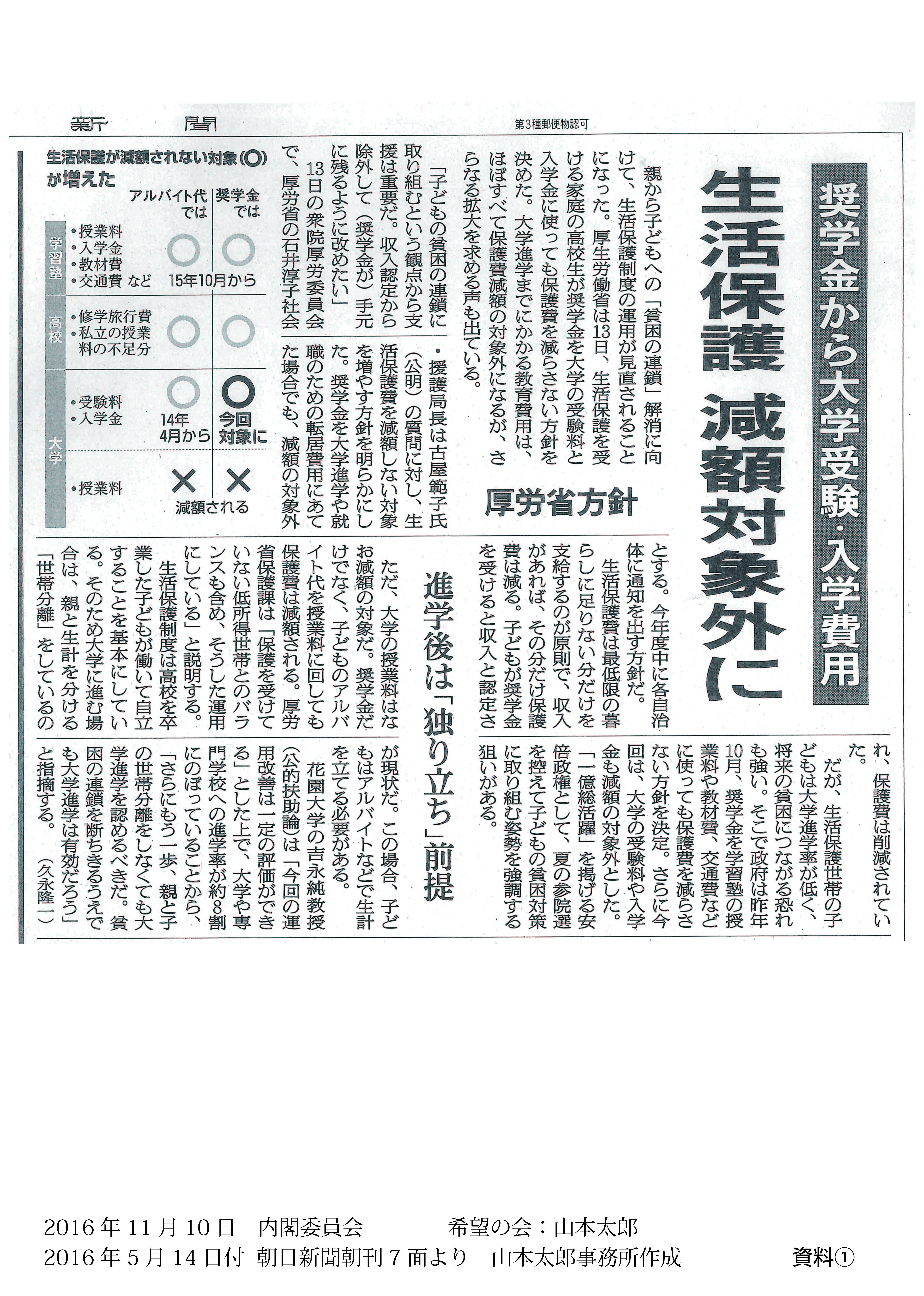 まず、一枚目の資料を御覧いただきますと、今年五月十四日、朝日新聞の記事がございます。奨学金を大学などの受験料、入学金に使う場合、収入認定除外する通知を今年度中に出すという記事ですね。二年前に、アルバイト代などを大学等の受験料、入学金に使う場合、収入認定から除外するという通知が出されてから、更に二年掛かってやっとこの通知を出していただけた。厚生労働省、大変すばらしい判断、ありがとうございます。そして、この答弁を勝ち取ってくださった、現在は厚労副大臣の古屋さん、ありがとうございます。
