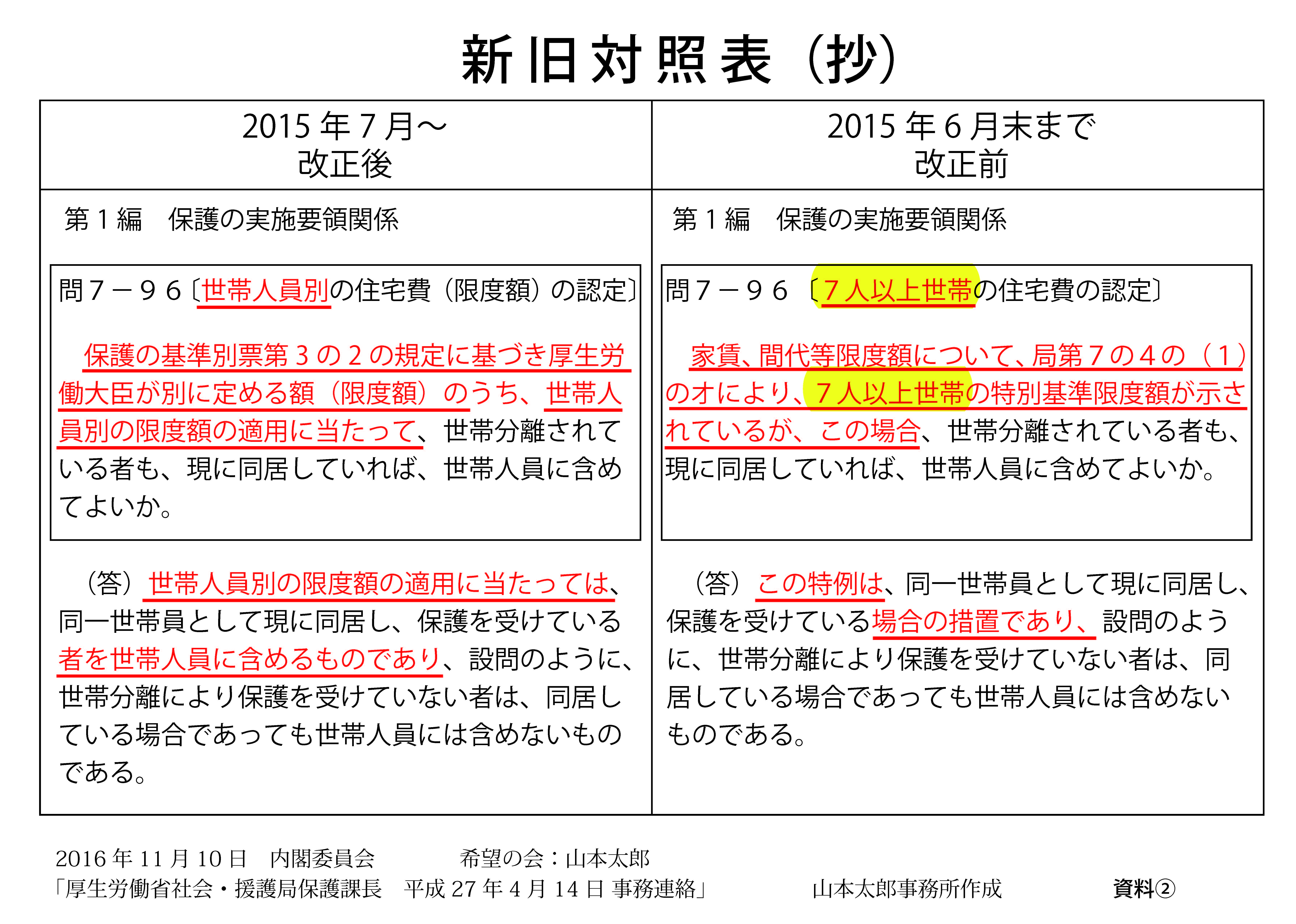 その生活保護手帳別冊問答集の二〇一五年バージョンで改定が行われた。資料の二枚目でございます。これが改定された、世帯分離された世帯についての住宅家賃の限度額についてというものですね。これ、援護局保護課長通知の事務連絡として出された新旧対照表でございます。右側の改正前、色が変わっています。七人以上世帯、そこは色が変わっている。左側の改正後を見てお分かりのとおり、七人以上世帯の文言、改正で削除されました。この七人以上世帯の文言が削られたことによって生活保護世帯の子供が大学進学した場合、大変なことになっていると、ベテランケースワーカーの方々から悲鳴が聞こえています。