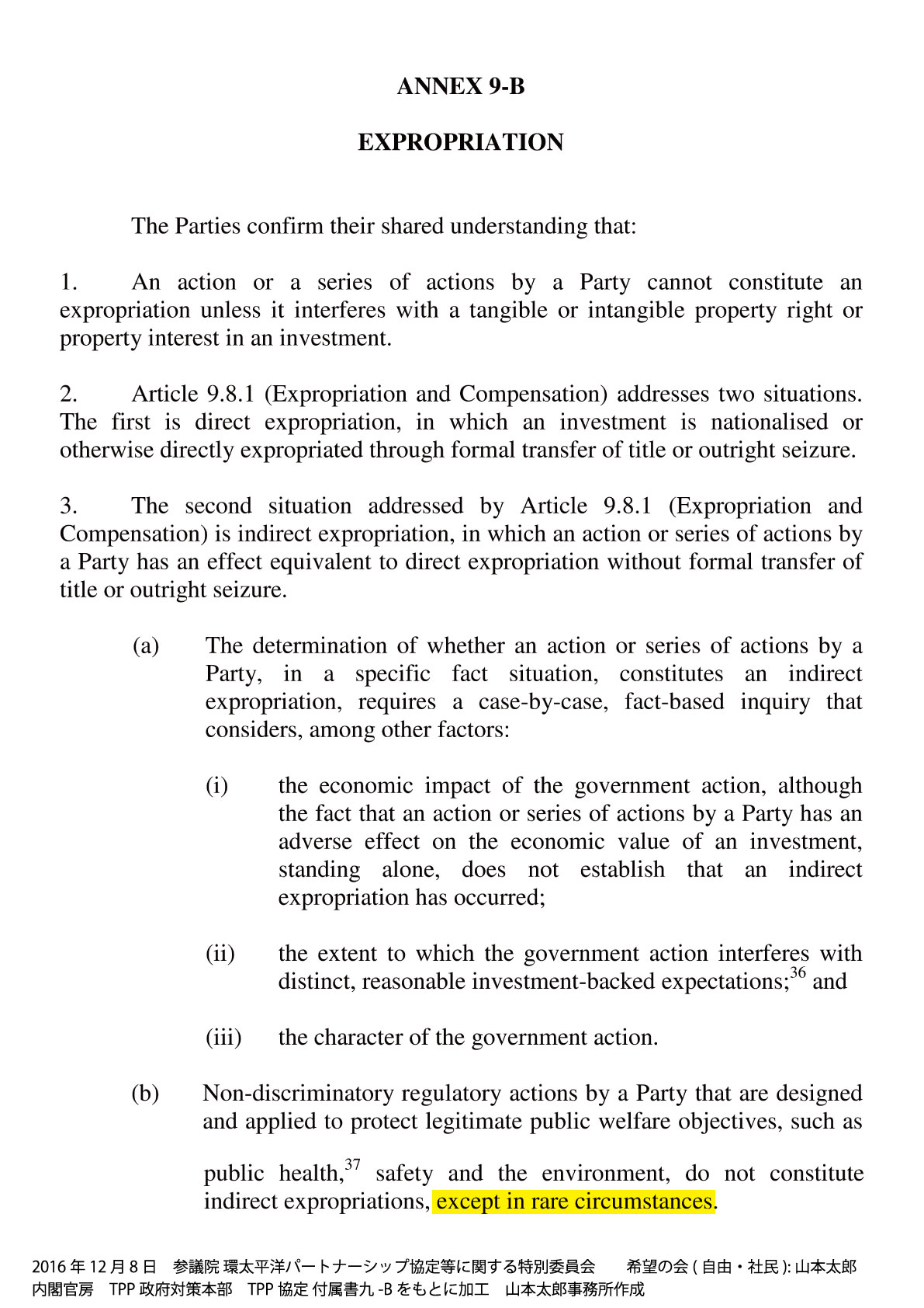 附属文書九のB第三項(b)を見てみます。これは、原則として公共の福祉を目的とする規制措置は間接収用に該当しないと言っています。前回の答弁で附属書九Bを挙げたのはそういう理由からだったと思うんですよね、そちら側が。しかし、条文の下の方、黄色いライン部分をちょっと拡大してみますね。条件限定、これやっぱり付いていることが分かるんですね。どういうことなのか。「極めて限られた場合を除く」と。どういうことか。つまり、公共の福祉を目的とする規制措置でも間接収用に該当する場合があると認めているわけですよね。じゃ、どんな場合に間接収用なんですか、極めて限られた場合ですと。極めてですから、単なる限られた場合よりも限定された、本当にレアなケースを指していると考えるのが普通ですよね。