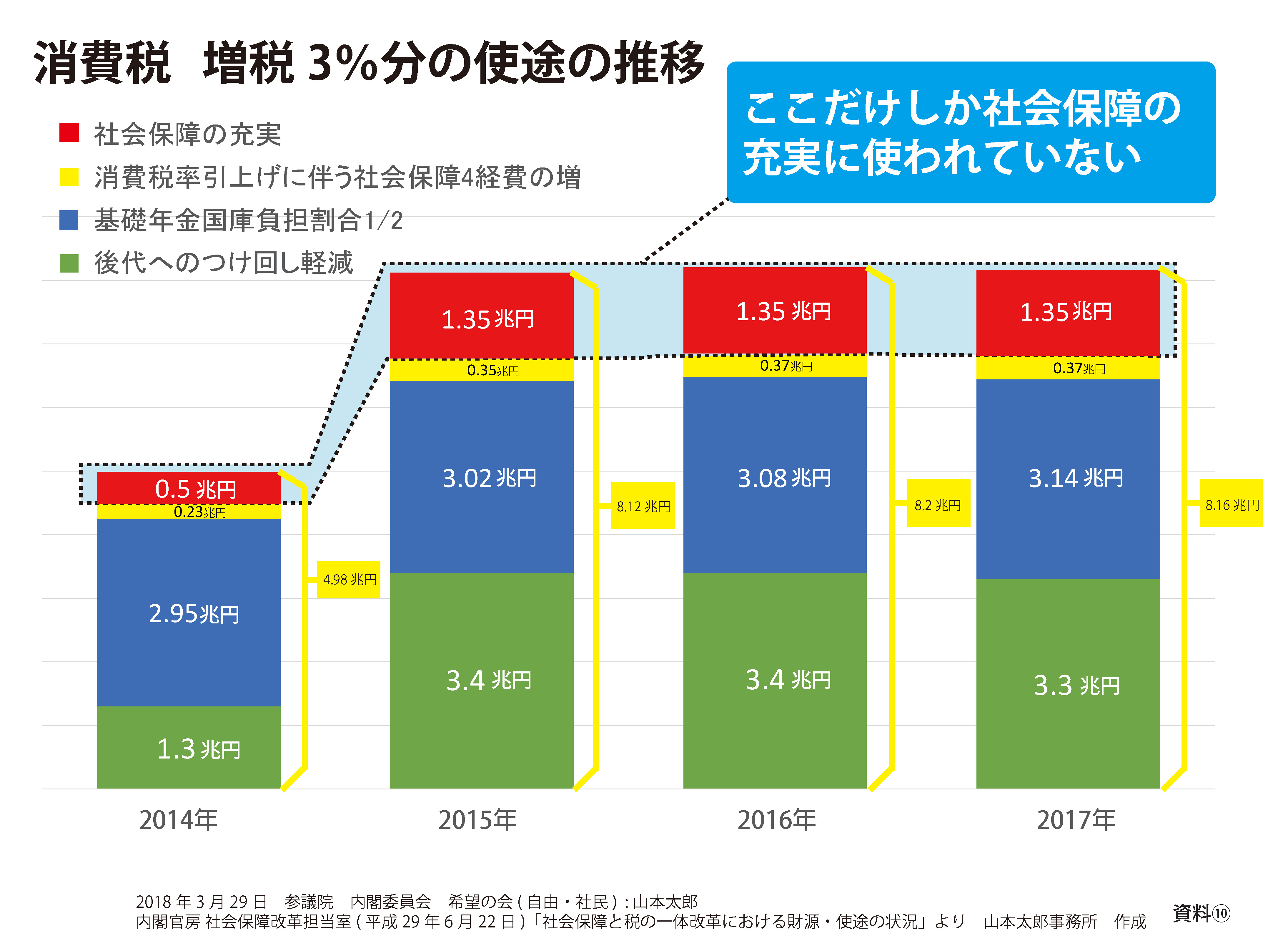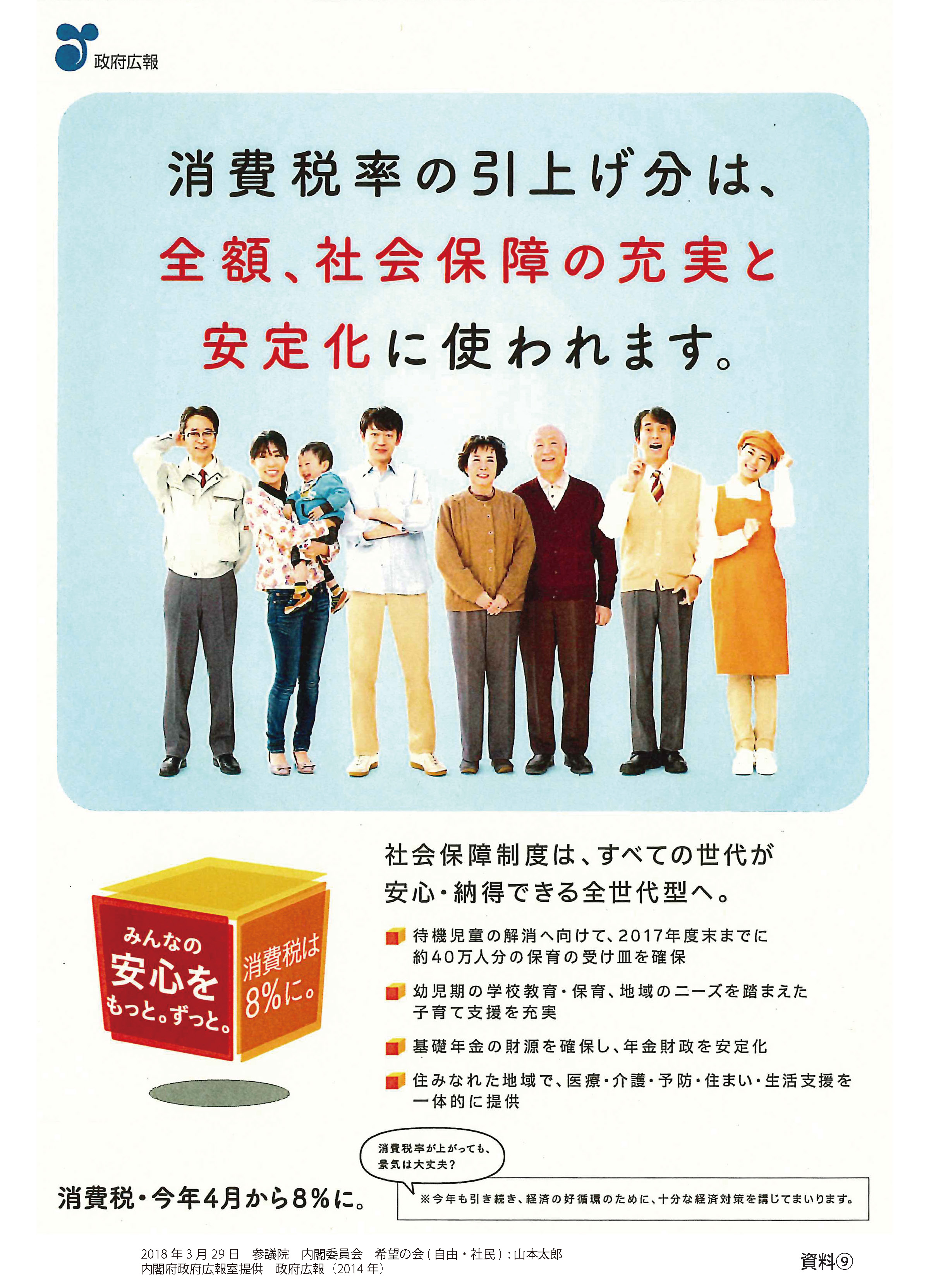 ○山本太郎君 資料の九、政府広報。(資料提示)消費税増税の三%分を何に使うかってことなんですね。消費増税分は全て社会保障の充実に使うというふうに書いてあります。