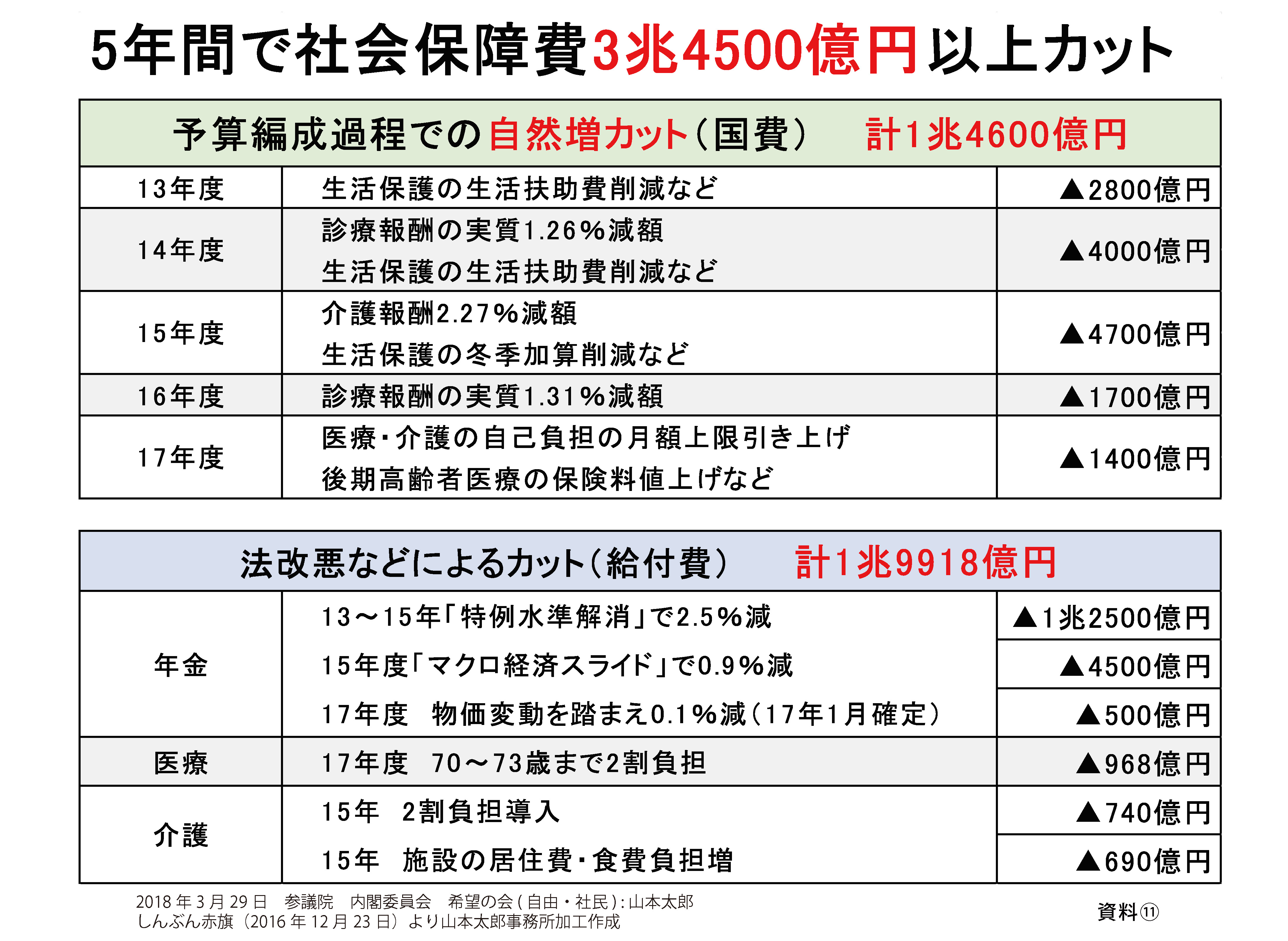 資料の十一、削減された社会保障費。これ、しんぶん赤旗ですよ。いつもいい記事、ありがとうございます。野党時代の自民党が何とか政権を取り返すために、俺たちは赤旗を読んだってことを自民党の先輩から聞いたことがあります。