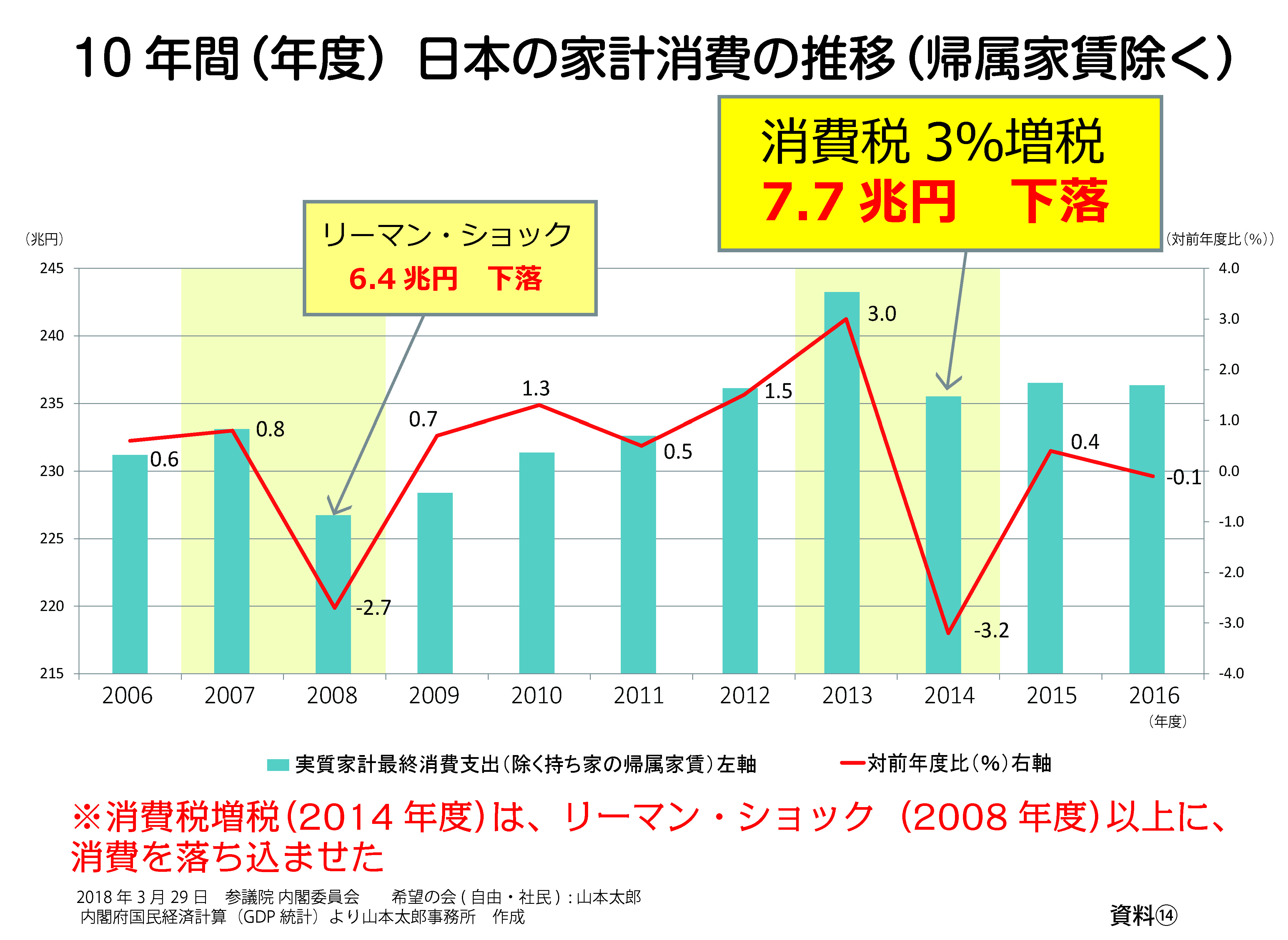 これ、共に年度、ブルーの棒グラフが帰属家賃を除く実質家計最終消費支出、赤の折れ線が対前年度比です。ブルーの二〇一三年を見ると駆け込み需要で上がっているけれども、一四年度にはがくんと下がる。七・七兆円の下落。リーマン・ショック前、その前と後を比べてもその下落幅は二〇一四年の消費税増税の影響大きいんですよ。消費税がいかに景気の足を引っ張っているか。子供つくるどころじゃない状況を生み出しているって、政治そのものが主導しているんですよ。