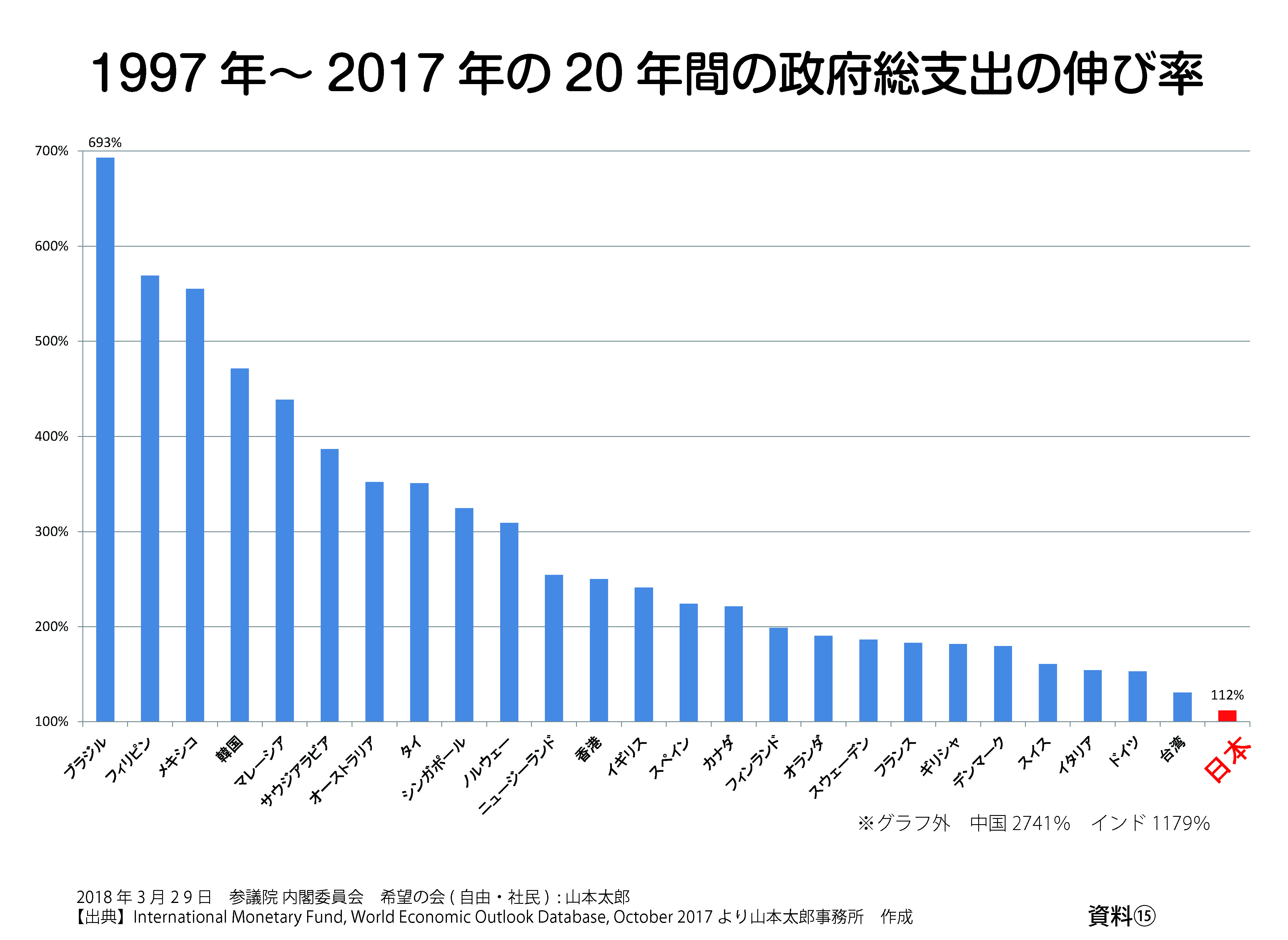 ○山本太郎君 資料の十五、IMFの調べ、九七年から二〇一七年までの二十年間の政府総支出の伸び率。日本、断トツのびりですよ。金出していないんです、人々に。不景気だ不景気だって、当たり前だよって、政府が金出さないんだもんって話です。