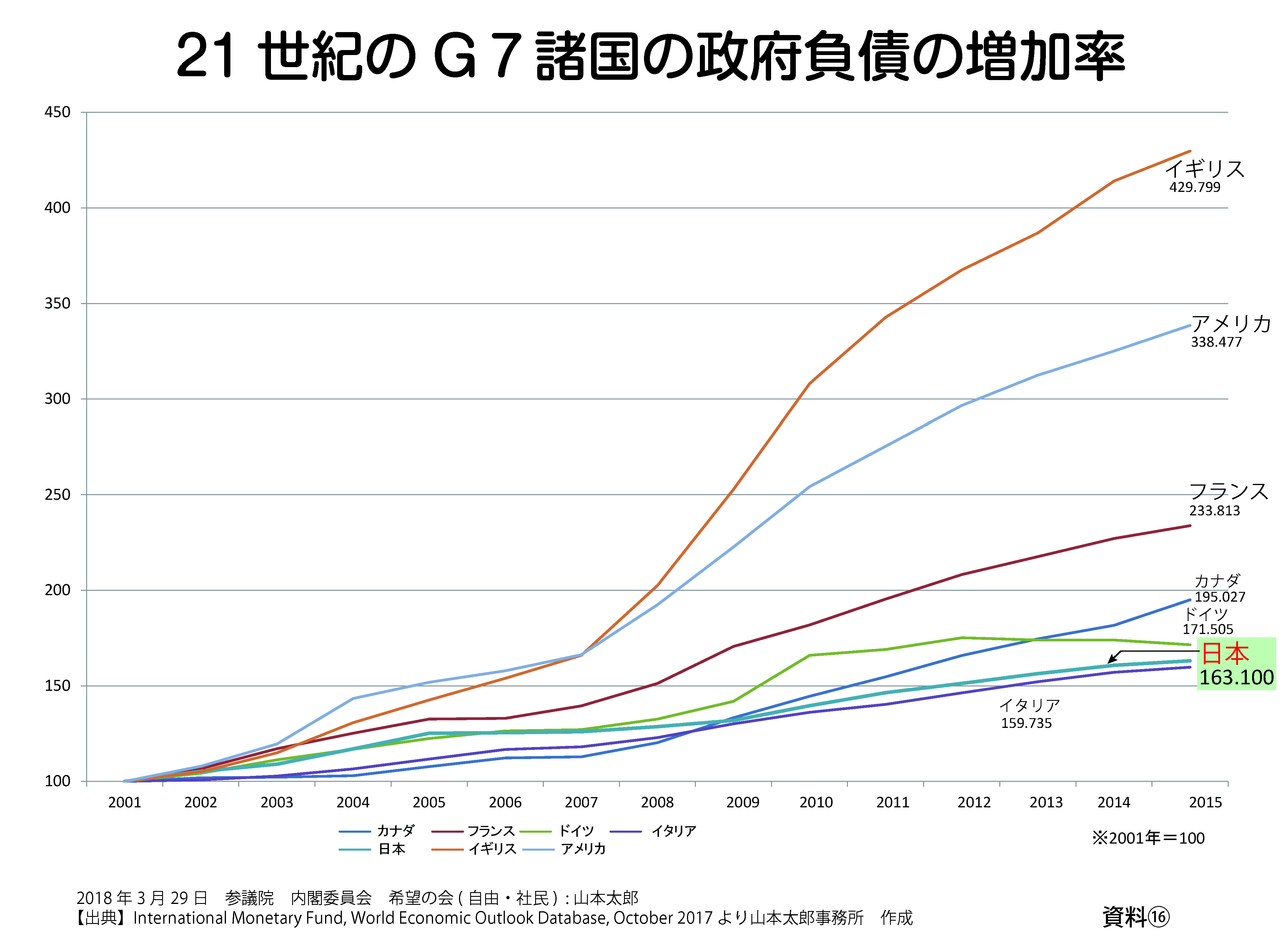 で、そう言うと、借金そんなにツケ回してどうするんだって話になりますけれども、続いて、資料の、次のページですね。日本の借金の増加率、そんな高くないんだって話なんですよ。イギリスとかアメリカとかフランスとか見てみてって、全然上だよって、もっと出さなきゃって、今必要なんですよ。なぜか。国民生活が完全に地盤沈下しちゃっているんですよ。これを何とか、この土台を何とかまたもう一度つくり直さなきゃどうにもならないんですね。