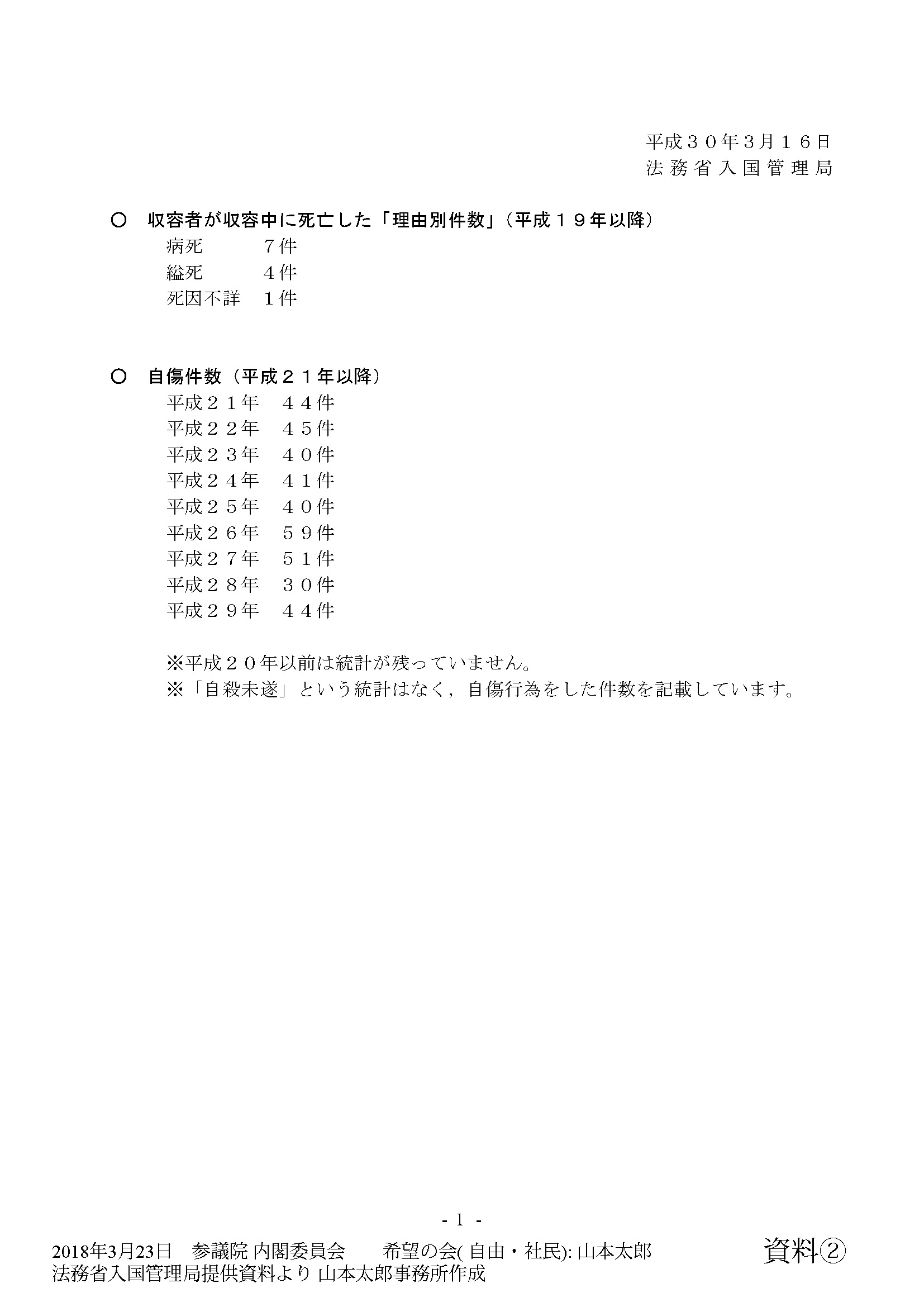 ○大臣政務官(山下貴司君) 昨年一年間に入国管理局の収容施設において発生した被収容者による自傷行為件数は四十四件でございます。なお、この自傷行為というのは、被収容者が自ら自分の身体を傷つける行為を指すということでございます。