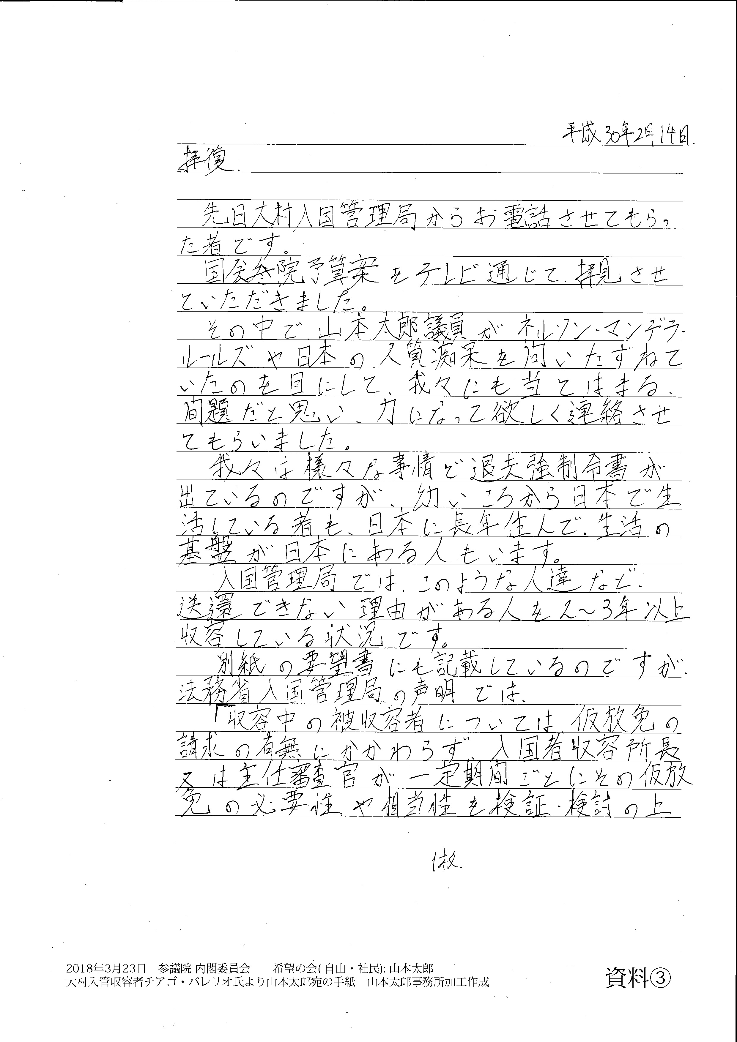 彼らの訴えは何なのか。医師に会いたい、そう求めても何週間も待たされて、一向に改善の気配すら見せずに容体を悪化させていく被収容者が少なくない。何も教えられず、家族と引き離され、拘禁され続けている。電話もインターネットもできず、自分が難民認定にふさわしい人間であるという証拠すら集める機会を与えられないなどなどなど、資料の三、一国会議員の私のところにも同様の改善要望が届くぐらいなんですよ。