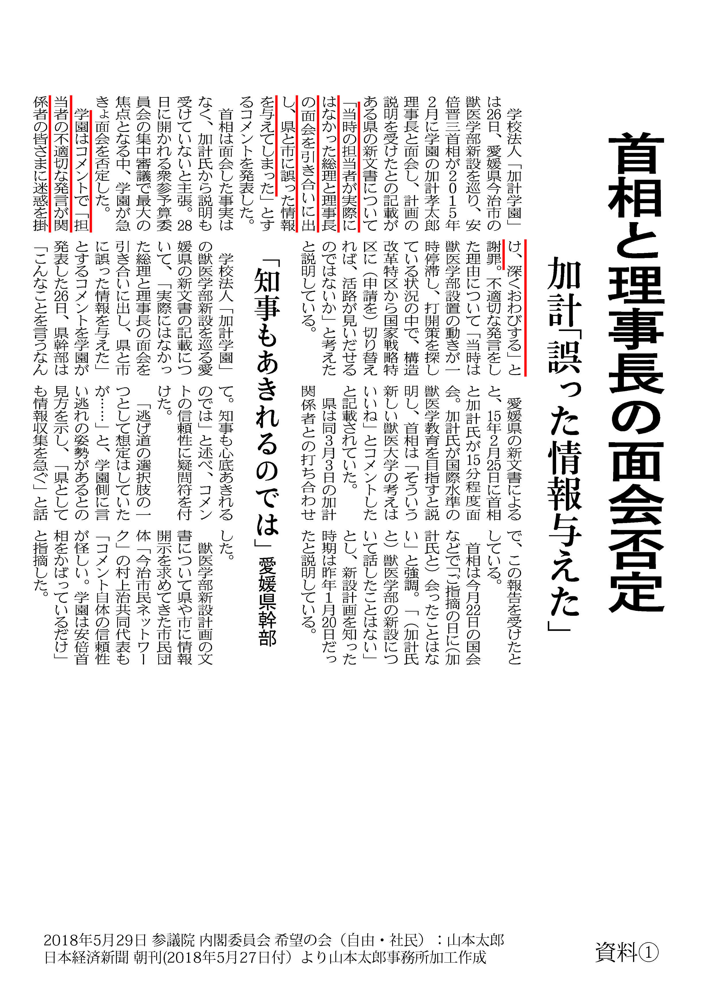 2015年2月25日の面会の記述について、要するにうその情報を愛媛県に伝えてしまったと突如ファクスでコメントを出したのが加計学園。資料の①、日経記事、赤線部分が加計理事長と安倍総理の面会がうそだったと言っている、そのような趣旨の内容の学園秘書室のファクスの内容なんですけどね。記者会見もなかった、一枚紙のファクスをマスコミに送り付けるだけと。まるで怪文書のような内容かと一瞬疑ったというようなコメントもテレビ局各局からありましたけれども。