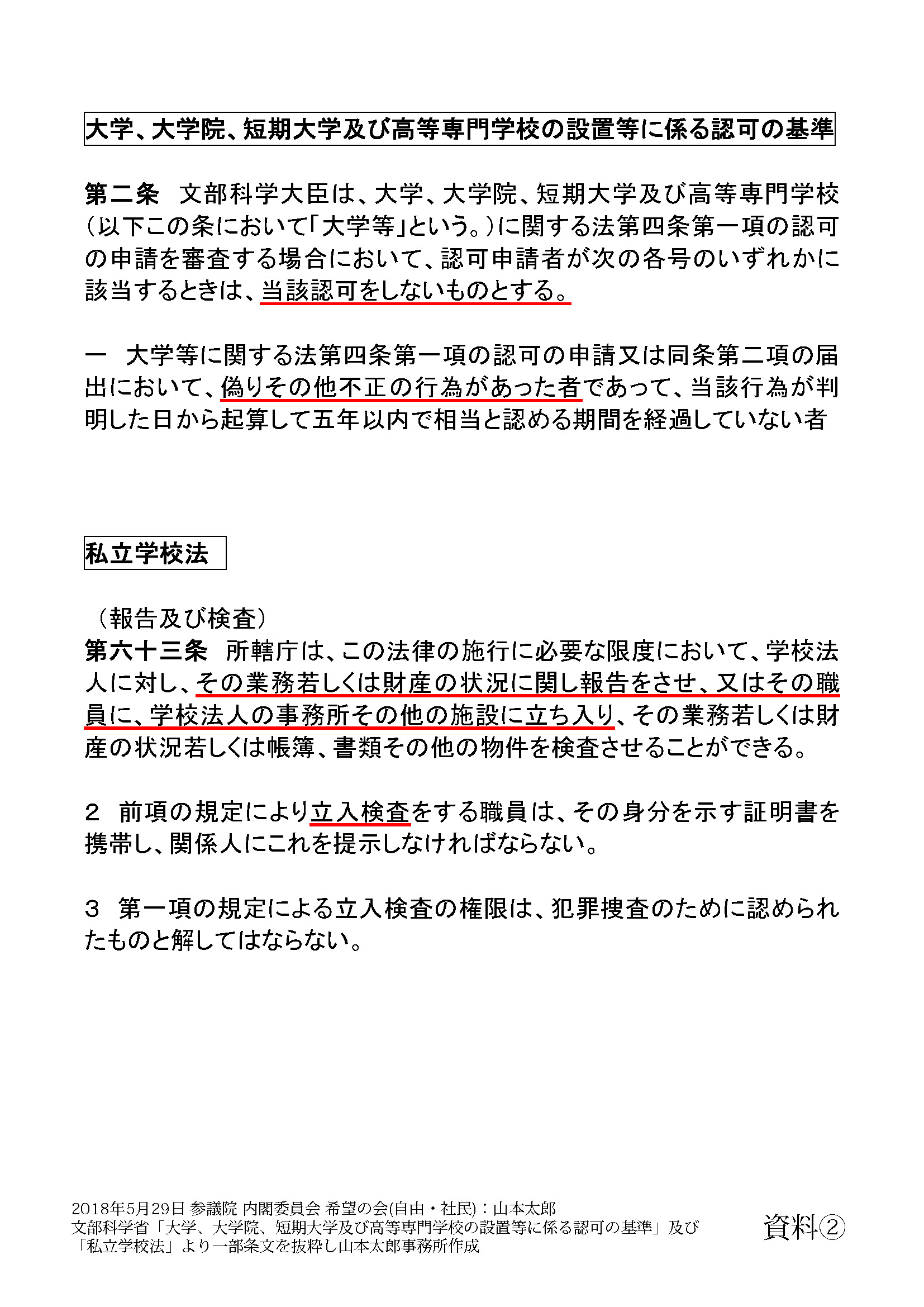 資料の②の上なんですけれども、これ、文科省の大学、大学院、短期大学及び高等専門学校の設置等に係る認可の基準なんですね。加計は、認可の申請又は届出において偽りその他不正の行為があった場合の文部科学大臣による不認可の規定に抵触するんではないでしょうか。いかがでしょうか? 認可後に不正が発生した場合の認可の効力についても教えてください。