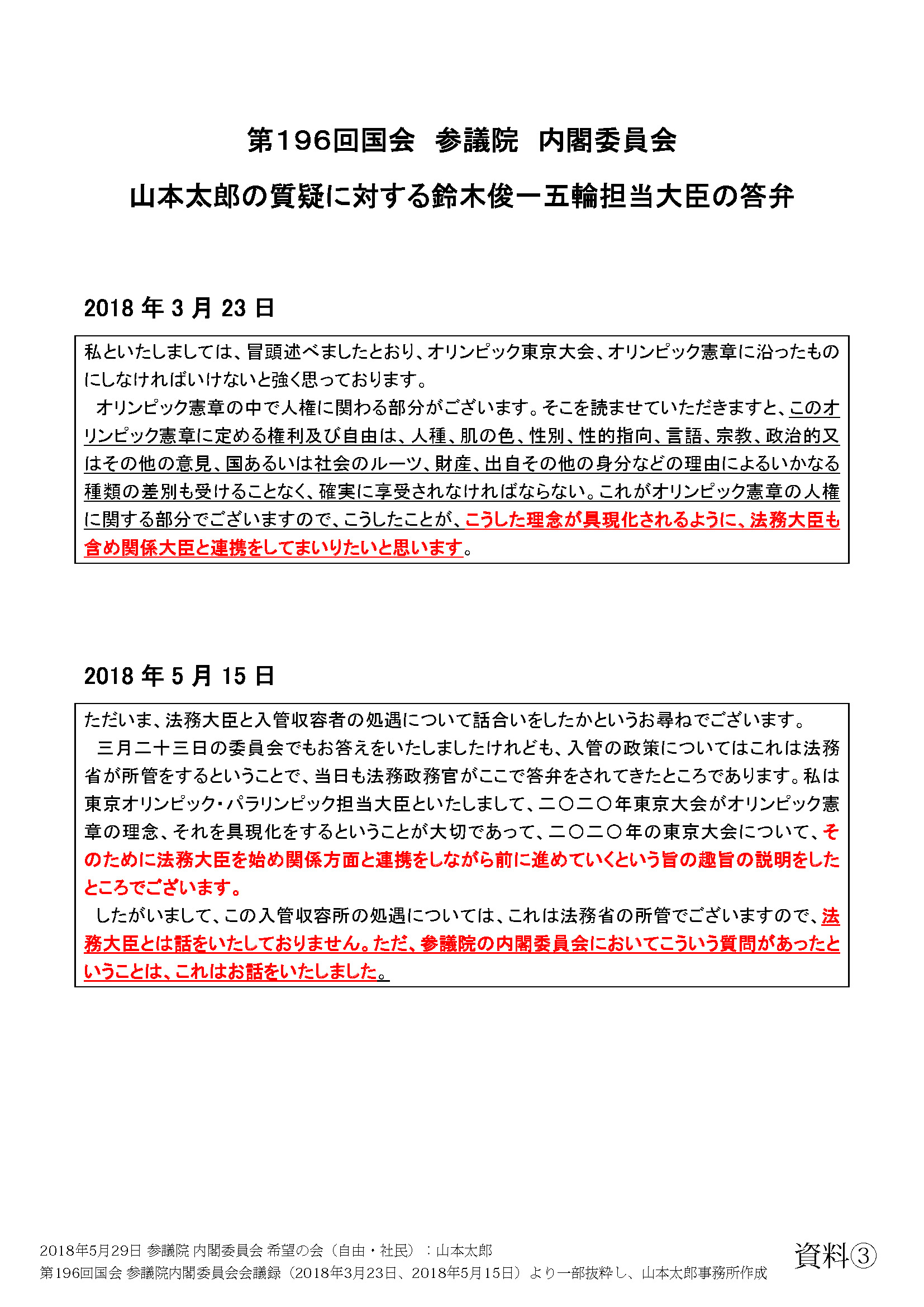 それに対し、鈴木大臣が、資料の③の上、「オリンピック憲章の人権に関する理念が具現化されるよう、法務大臣も含め関係大臣と連携をしてまいりたい」と、すばらしい御答弁をいただきました。