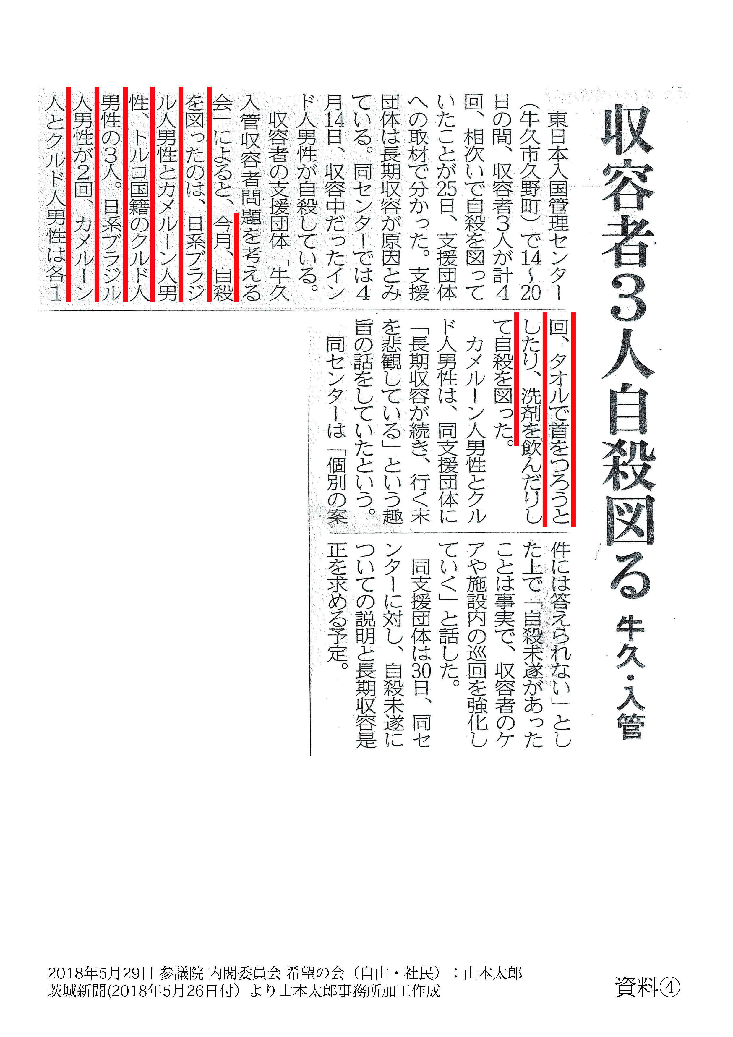 資料の④。この答弁が行われた前後数日の間、5月14日から20日の間に、東日本入国管理センターでは、収容者3人が計4回、相次いで自殺を図っていたことが発覚。