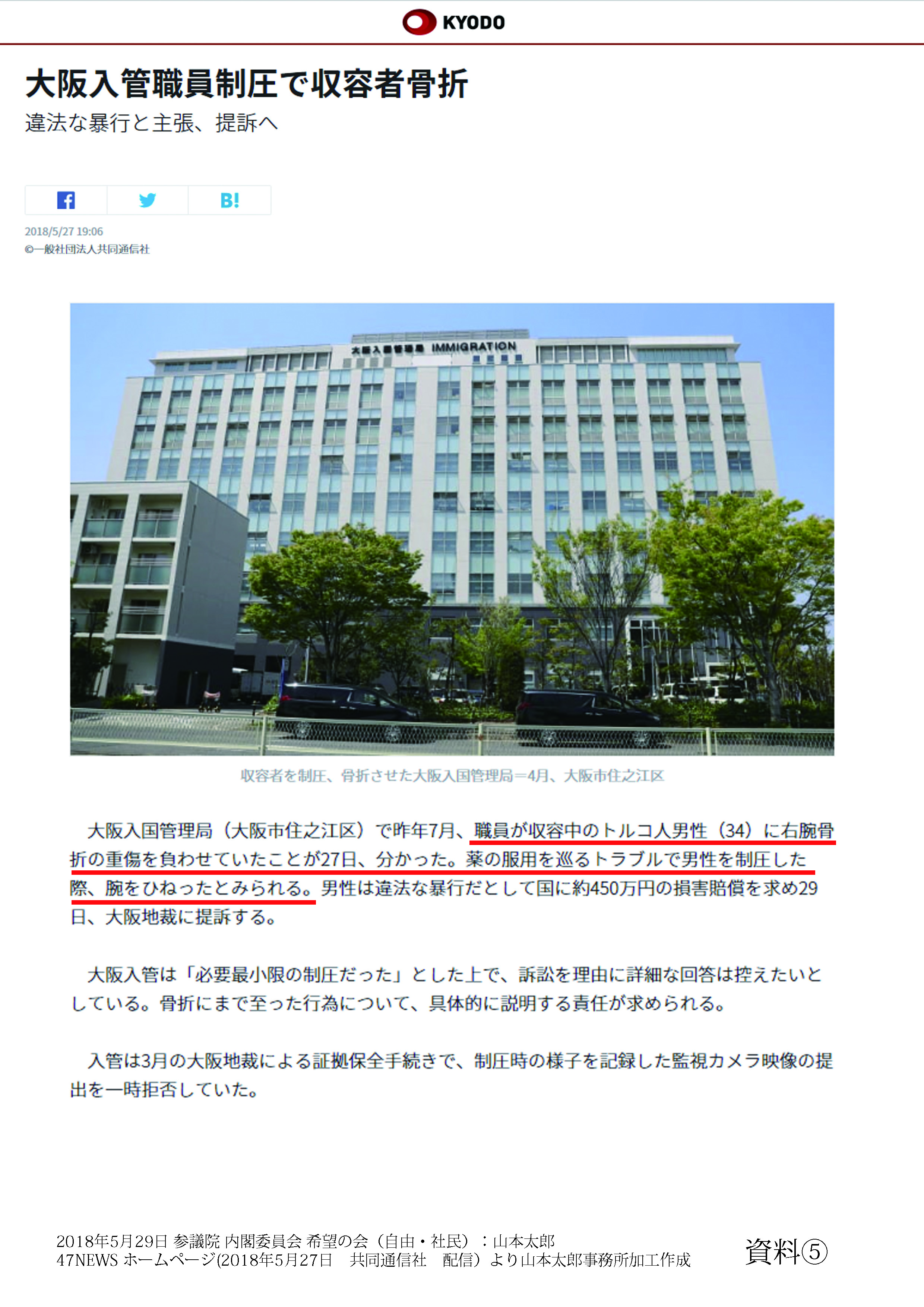 昨年の7月、大阪入国管理局職員が、薬の服用をめぐるトラブルで収容中のトルコ人男性を制圧した際、腕をひねり骨折させています。これ、今日、弁護団が記者会見を行います、地裁に提訴後。その制圧時の動画も記者会見で流すそうなんですね。必要最小限の制圧だったと入管は言うけど、必要最低限の制圧が骨折っておかしいじゃないですか。これまでにも制圧時に死亡者を出しているのが入管なんですよ。大臣、是非お話をしていただきたい。