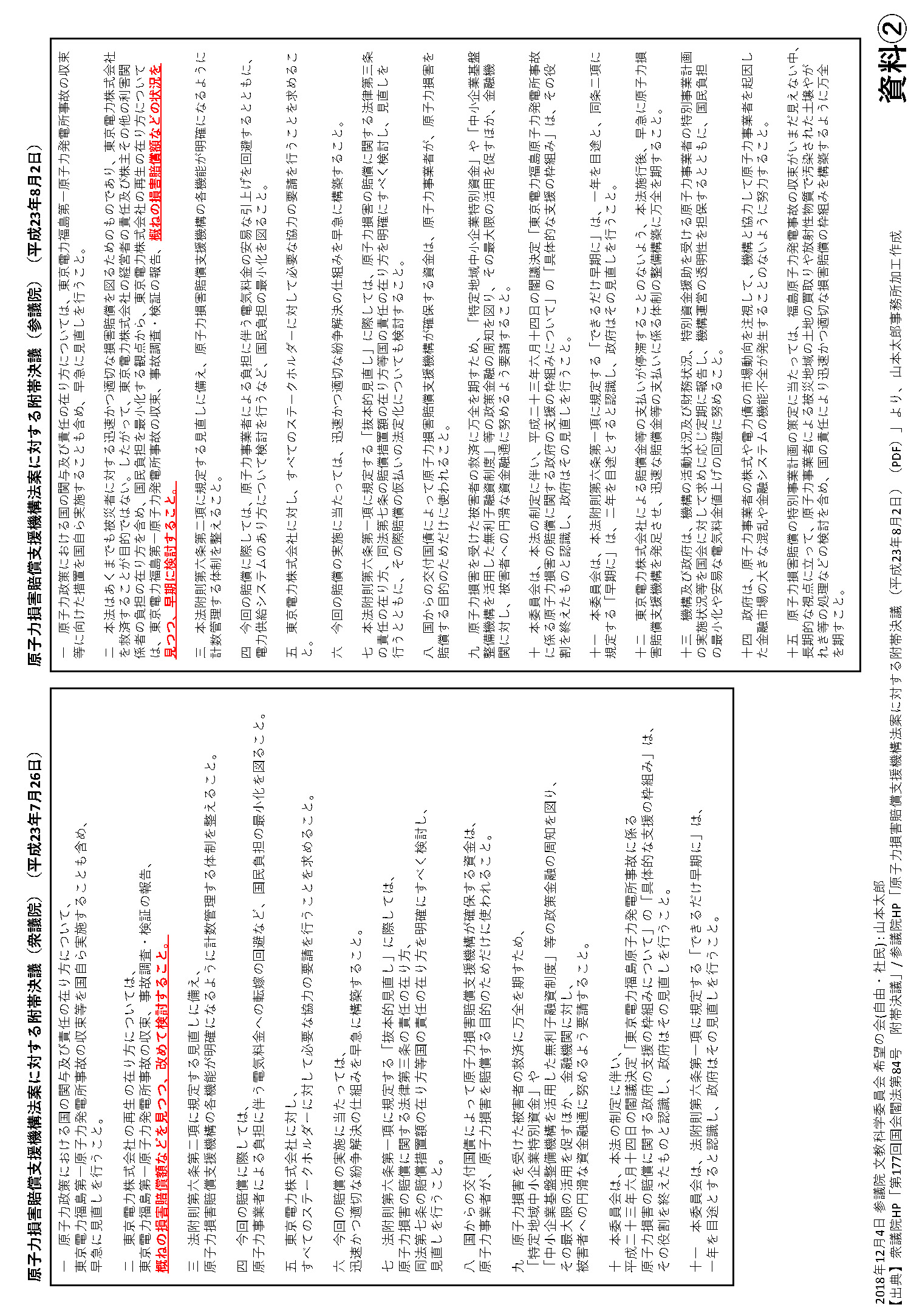 資料の②、2011年改正の際、衆参で決議された附帯決議では共に、おおむねの損害賠償額などを見つつ、改めて検討することとされていますね。