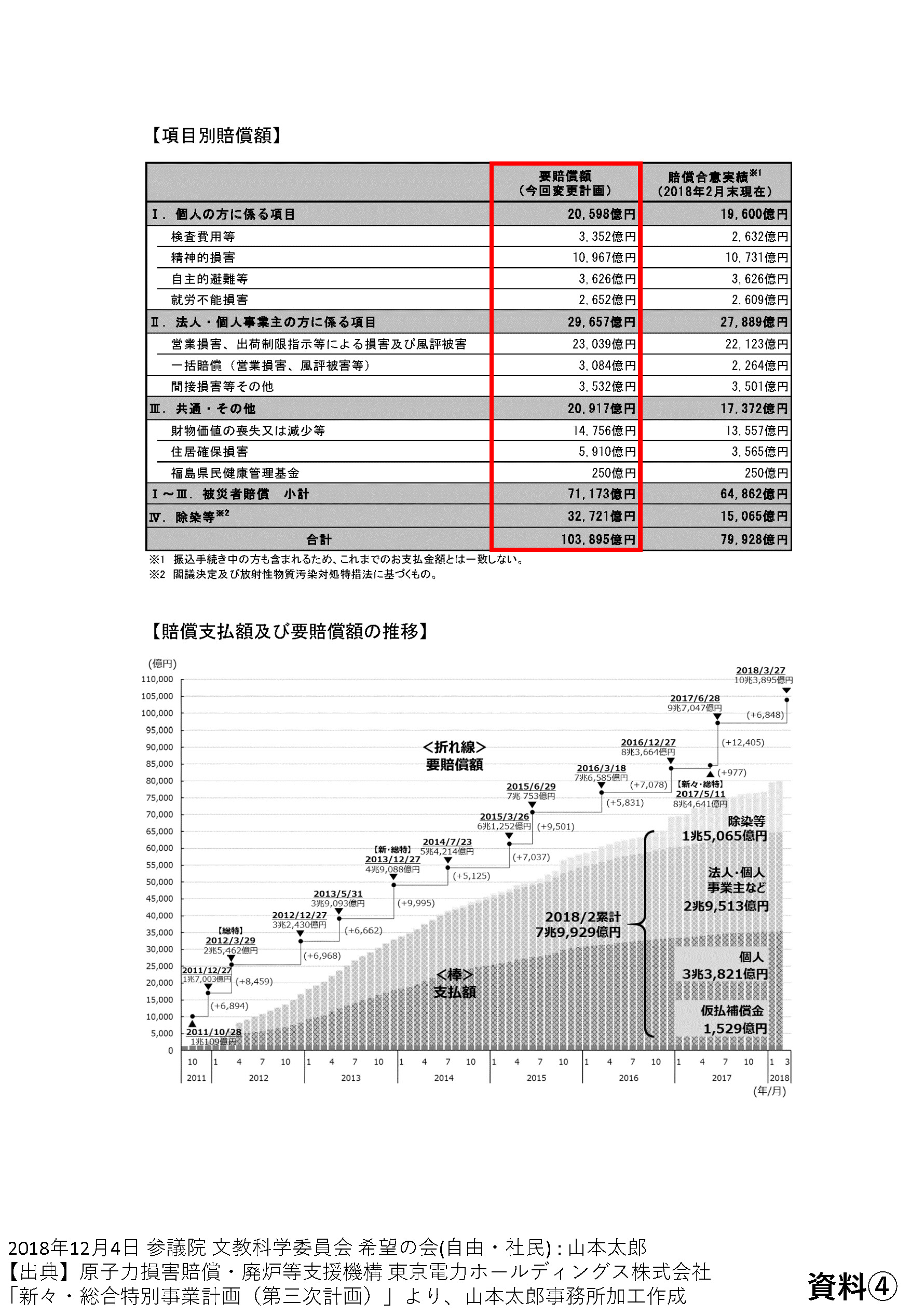 資料の③、東京電力ホームページ内、賠償金のお支払状況、東電は被害者に対して2018年十月末現在で約8・6兆円の支払をしている。