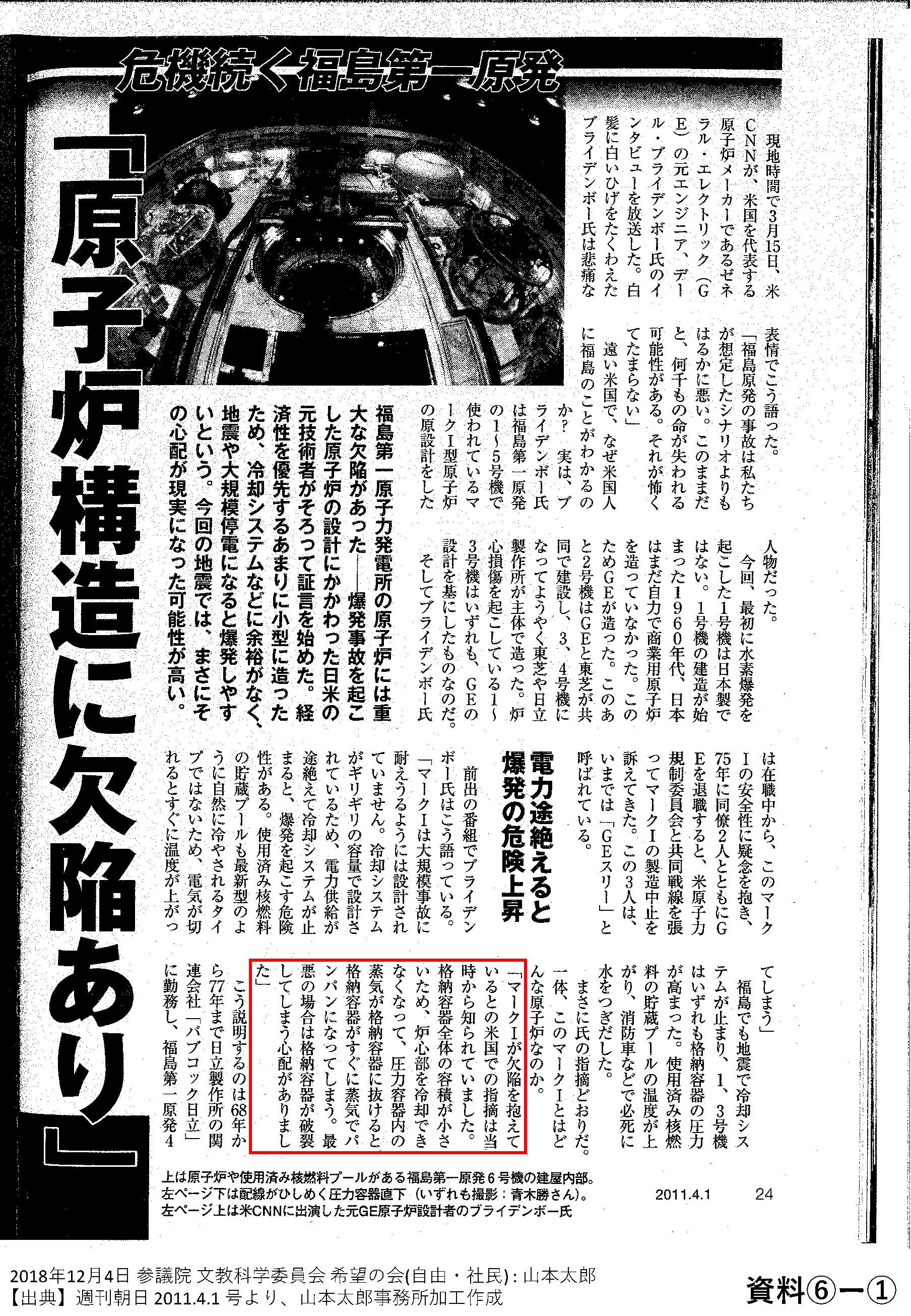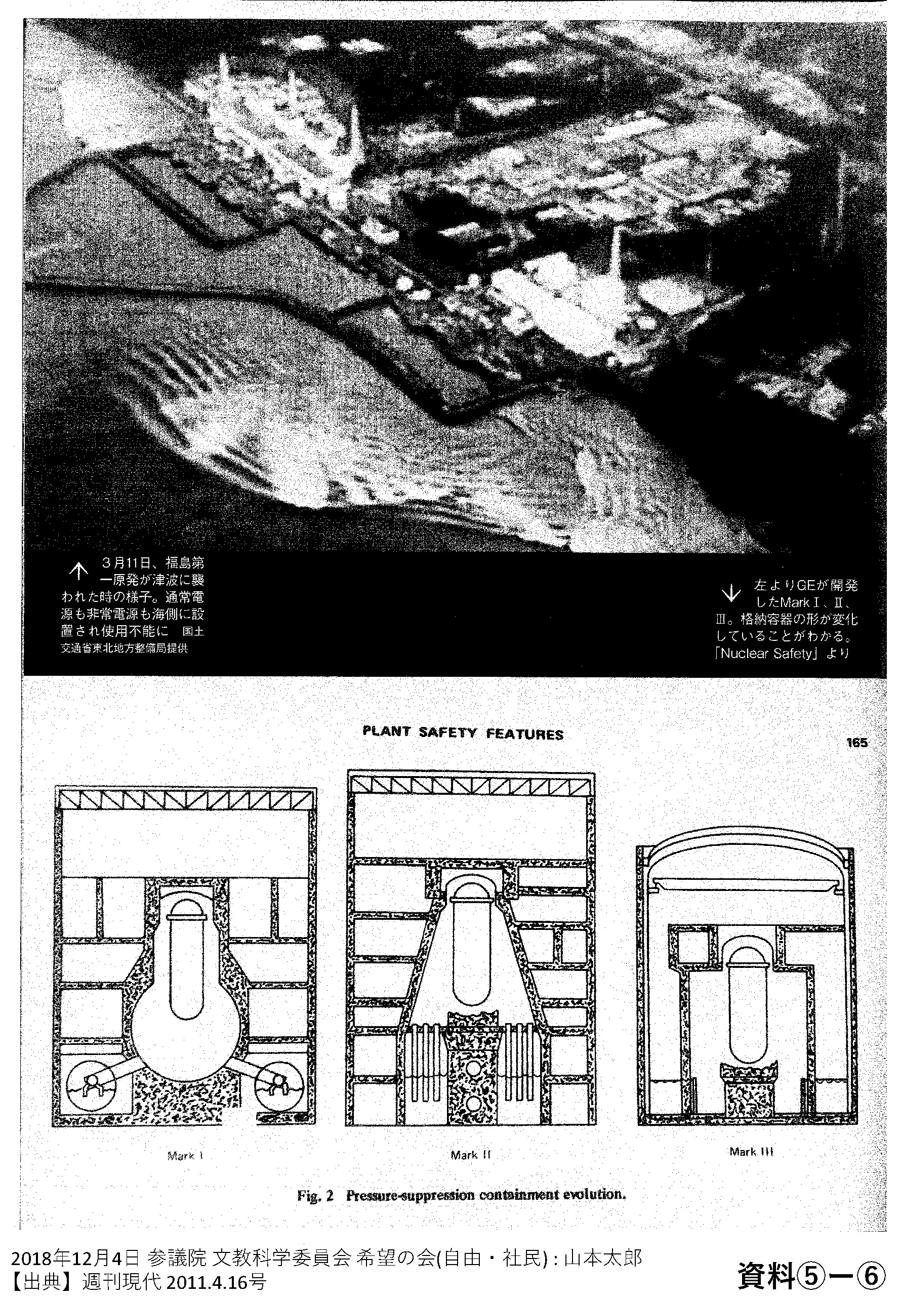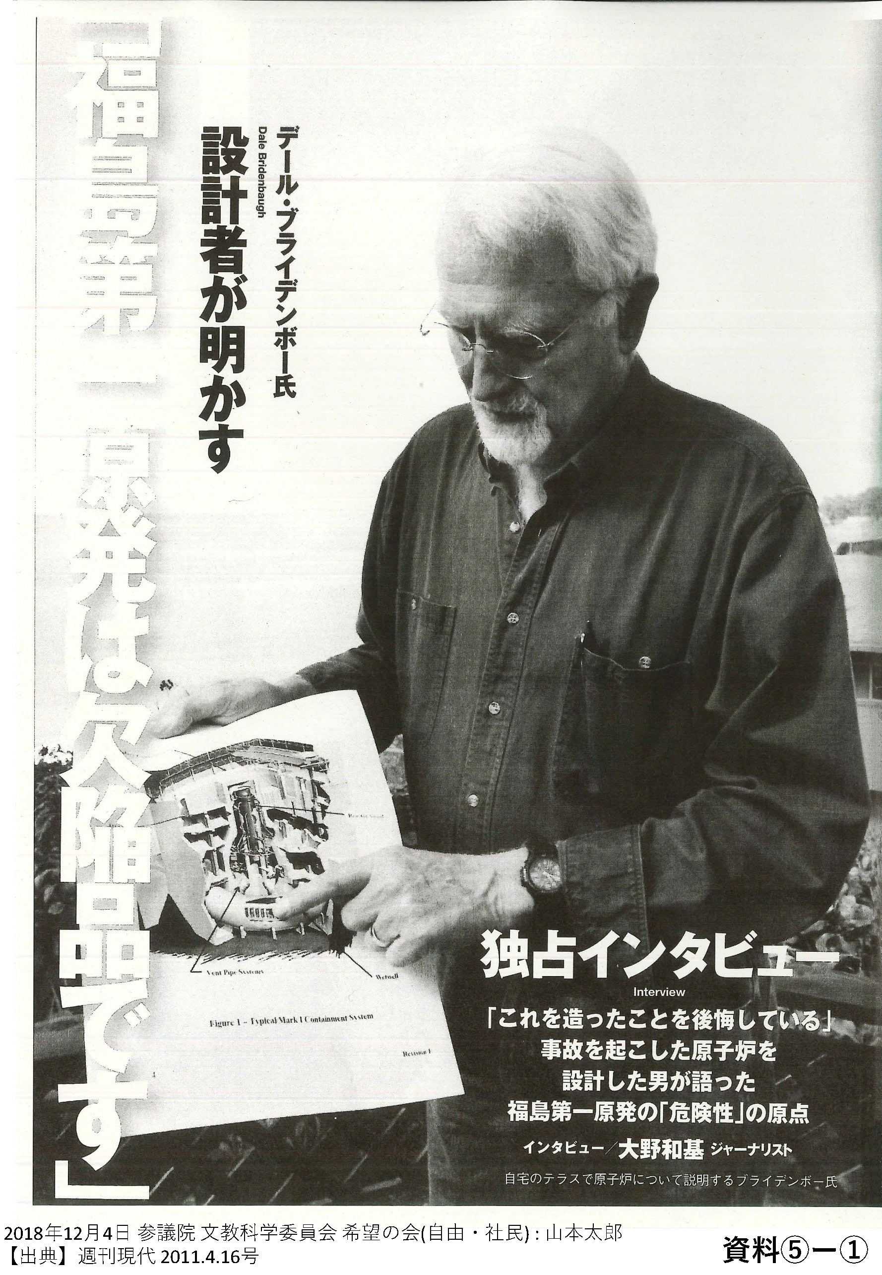 資料の⑤の①、福島第一原発の1から5号機で使われているマークⅠ型原子炉の原設計をしたGE、ゼネラル・エレクトリック元エンジニア、デール・ブライデンボー氏は、マークⅠは、地震や津波などの大きな災害によって冷却機能を喪失すると、格納容器に想定された以上の負荷が掛かり、破裂する可能性がある、そのことが明らかになったのだ、つまり私たちの間で語られているデザインスペースの事故、つまり設計ミスから事故が起こるかもしれないということがはっきりしたのであると語っています。普通にこんな商品売ったらアウトでしょって。リコールですよ、回収ですよ、普通。