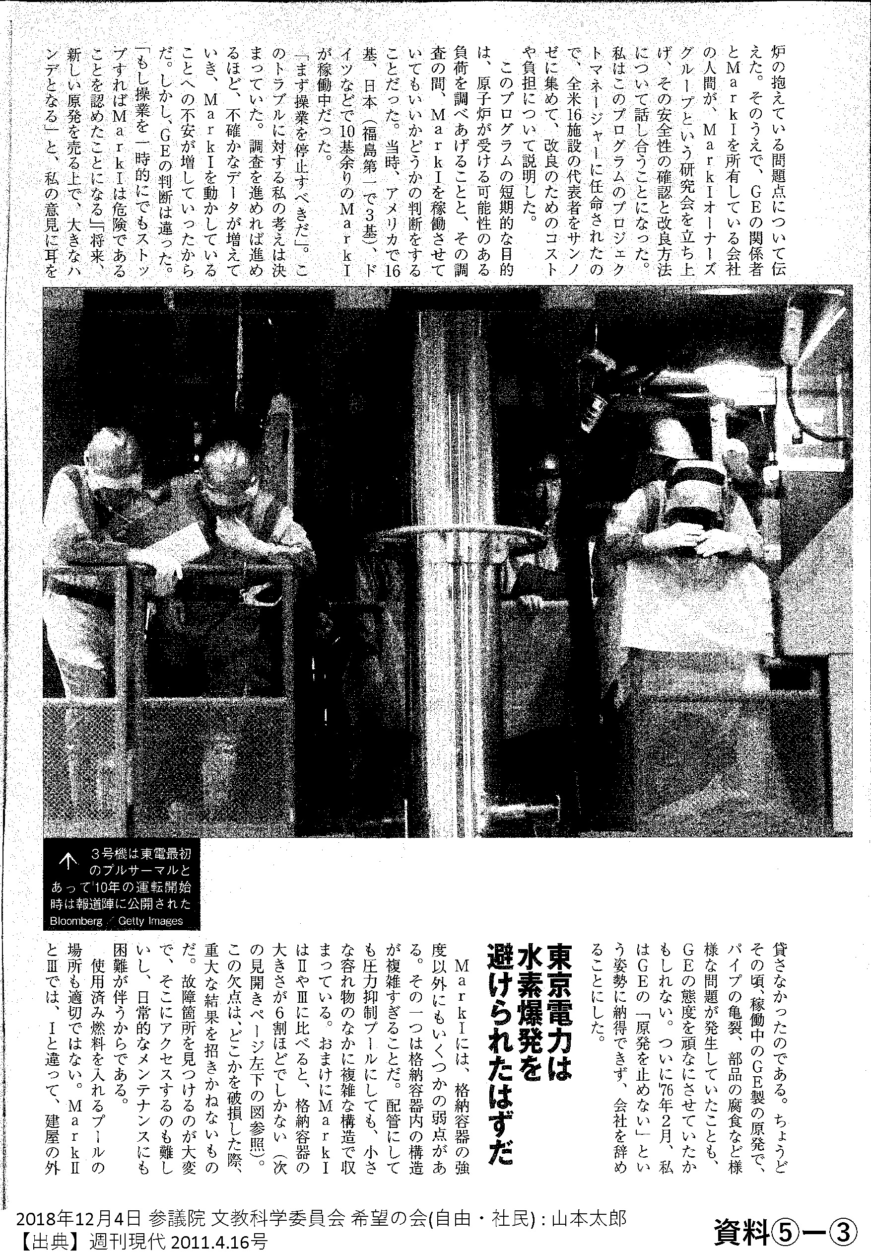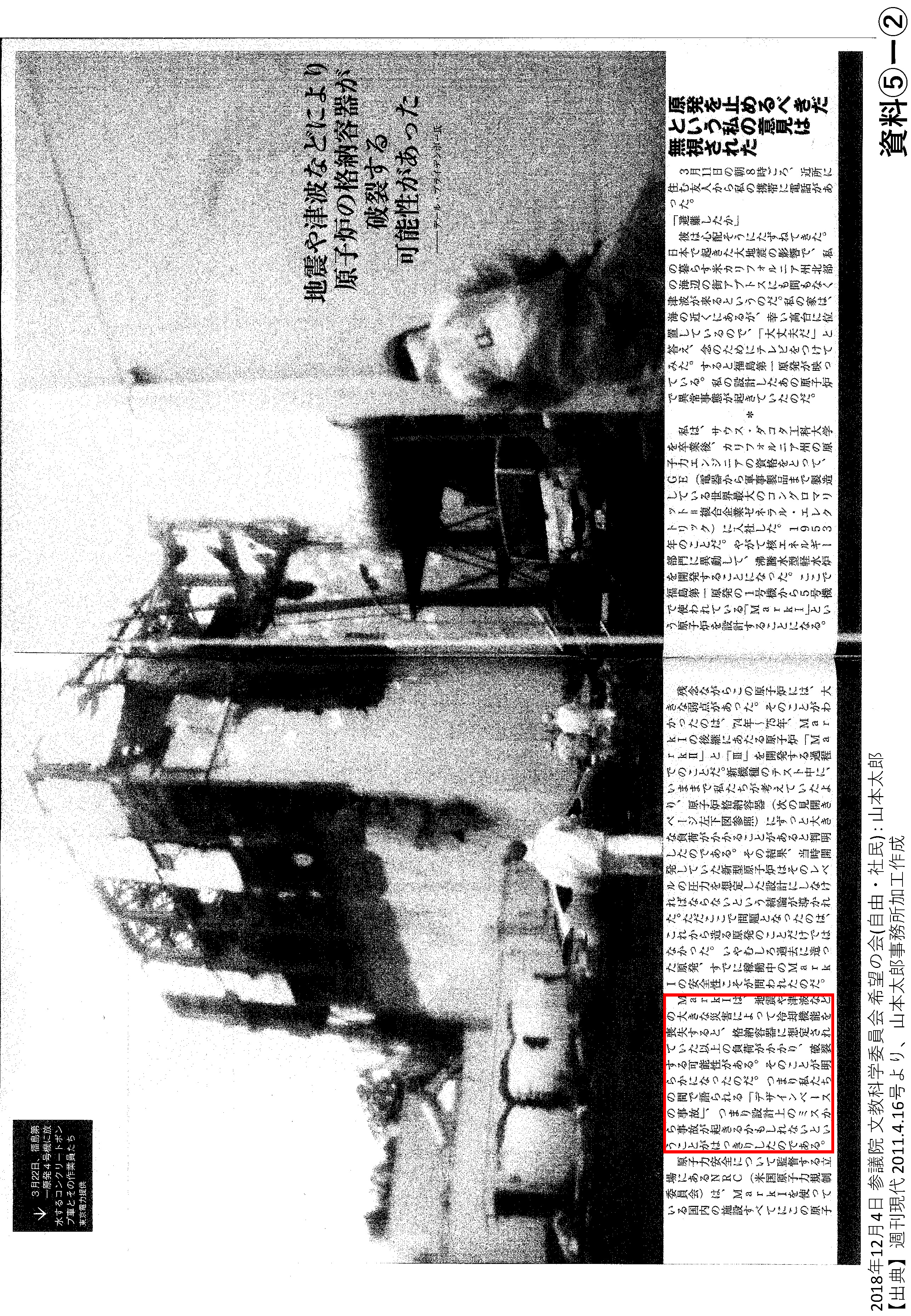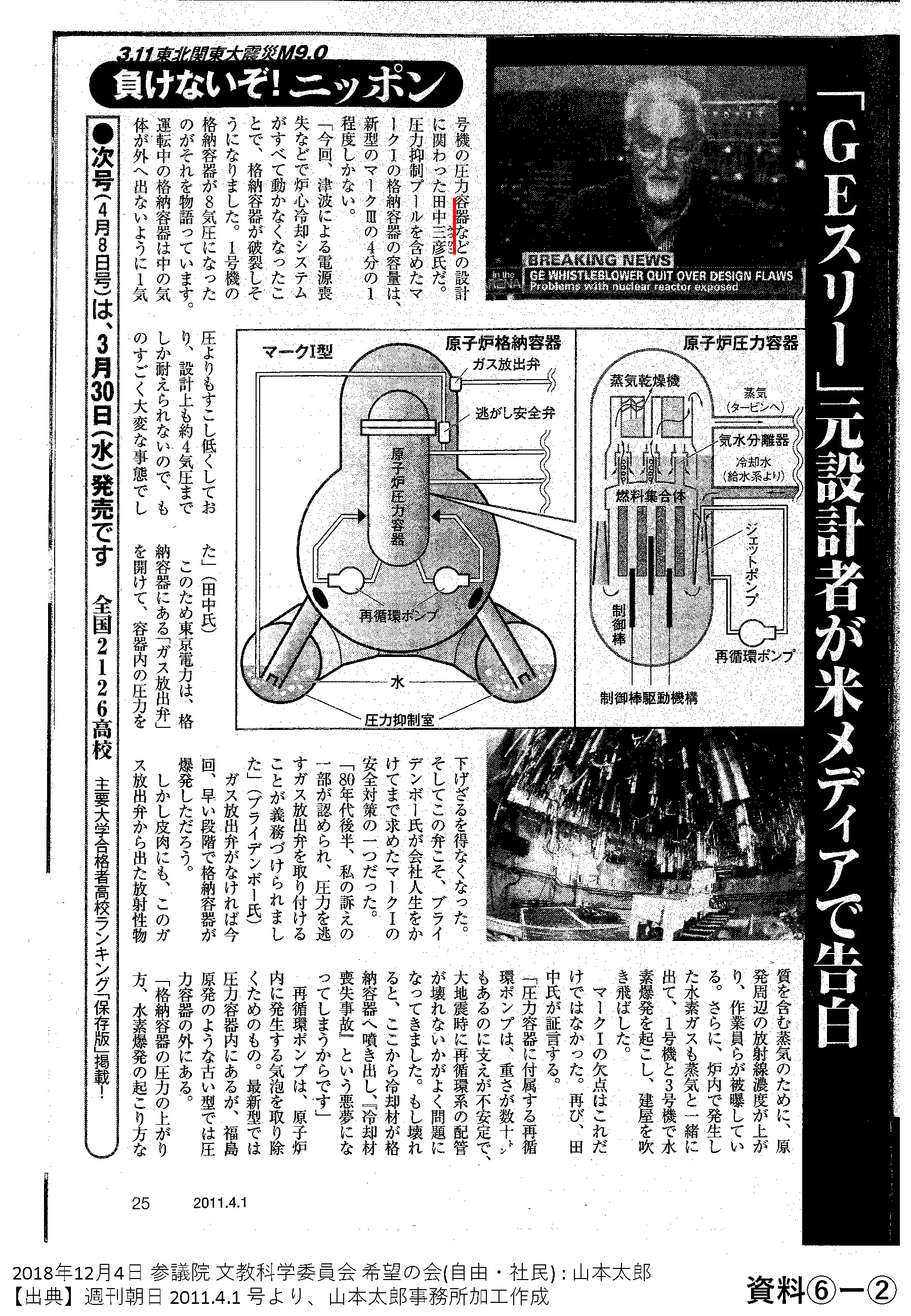 資料の⑤の①、福島第一原発の1から5号機で使われているマークⅠ型原子炉の原設計をしたGE、ゼネラル・エレクトリック元エンジニア、デール・ブライデンボー氏は、マークⅠは、地震や津波などの大きな災害によって冷却機能を喪失すると、格納容器に想定された以上の負荷が掛かり、破裂する可能性がある、そのことが明らかになったのだ、つまり私たちの間で語られているデザインスペースの事故、つまり設計ミスから事故が起こるかもしれないということがはっきりしたのであると語っています。普通にこんな商品売ったらアウトでしょって。リコールですよ、回収ですよ、普通。